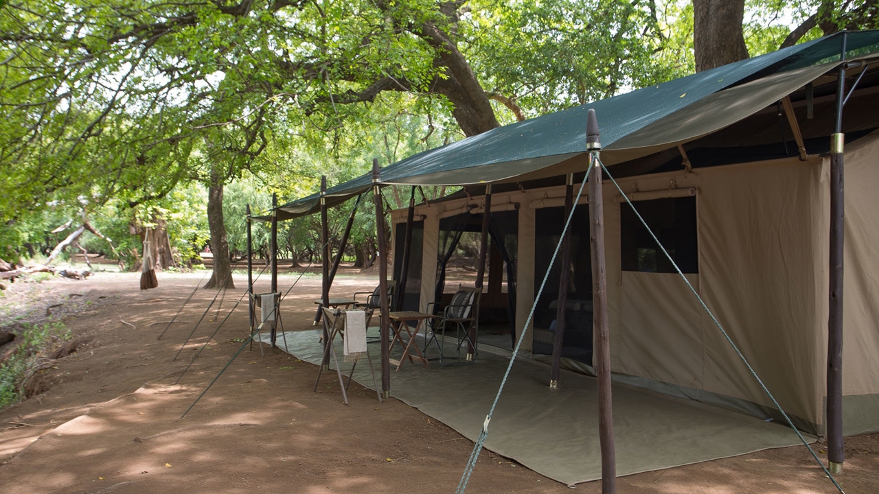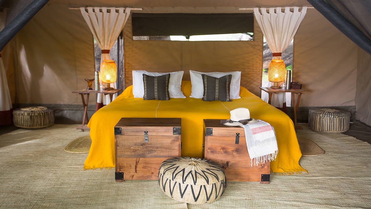 The canvas camp includes a mess tent and a maximum of seven sleeping tents. The accommodation is simple, but comfortable, with sturdy walls and floors. Each tent has a veranda and en-suite facilities with hot water and flushing toilets. Natural wood and woven rugs add a warm touch to the tents, along with bold earthy colours and luxurious fabrics.