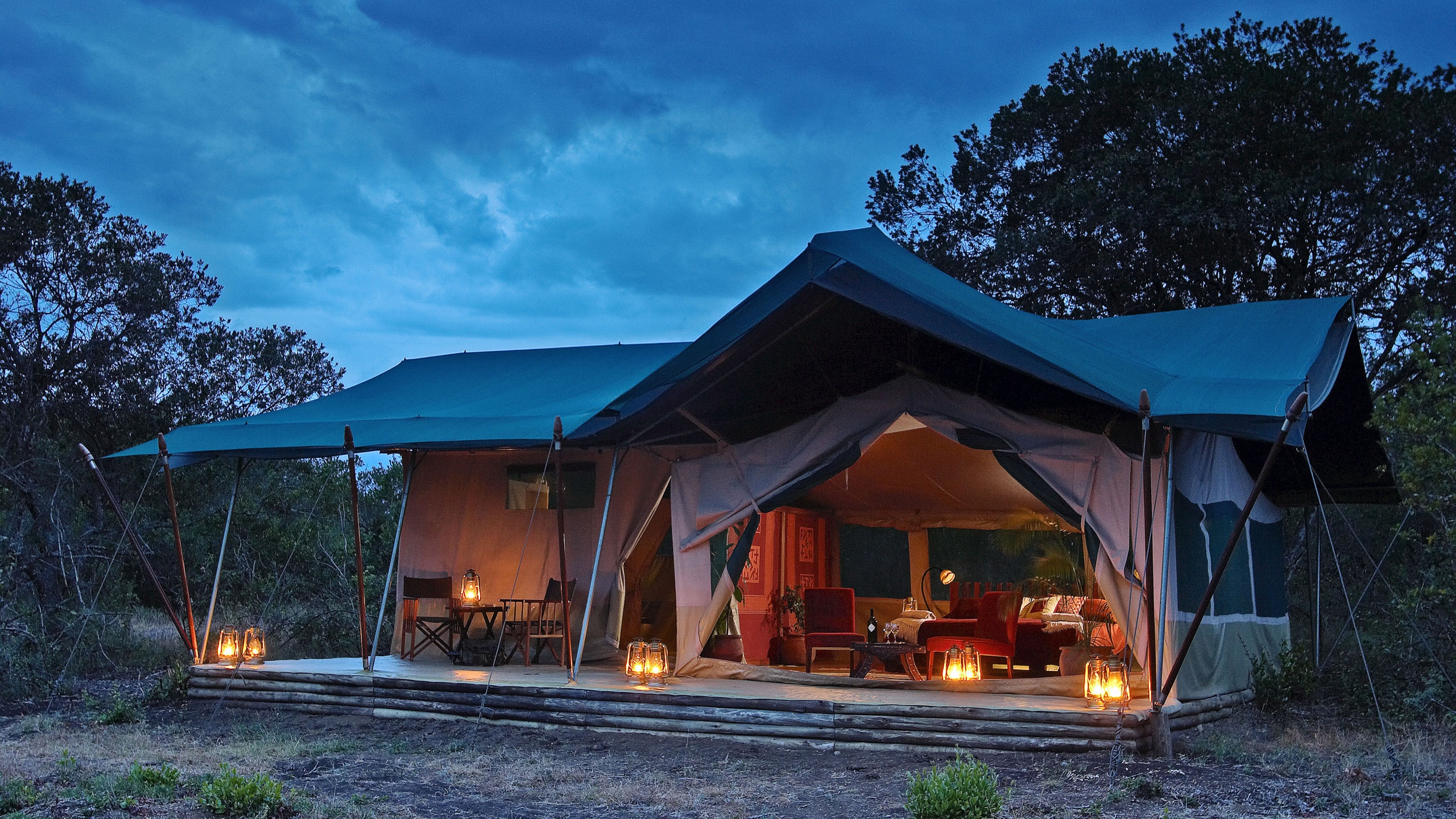 The camp itself has just six tented suites, with a verandah from which you can occasionally spot game at the dam, a magnet for wildlife during the dry season. A well-furnished lounge and dining tent have two roaring fires for the cooler evenings. Breakfast, lunch and dinner are often taken al-fresco and pre-dinner drinks and star gazing are a must under the great African sky.