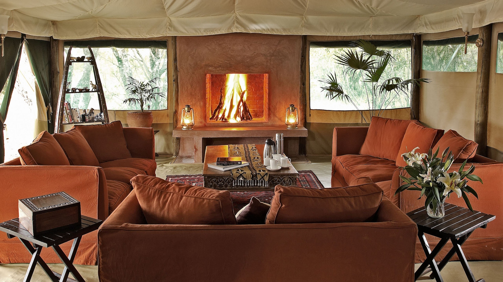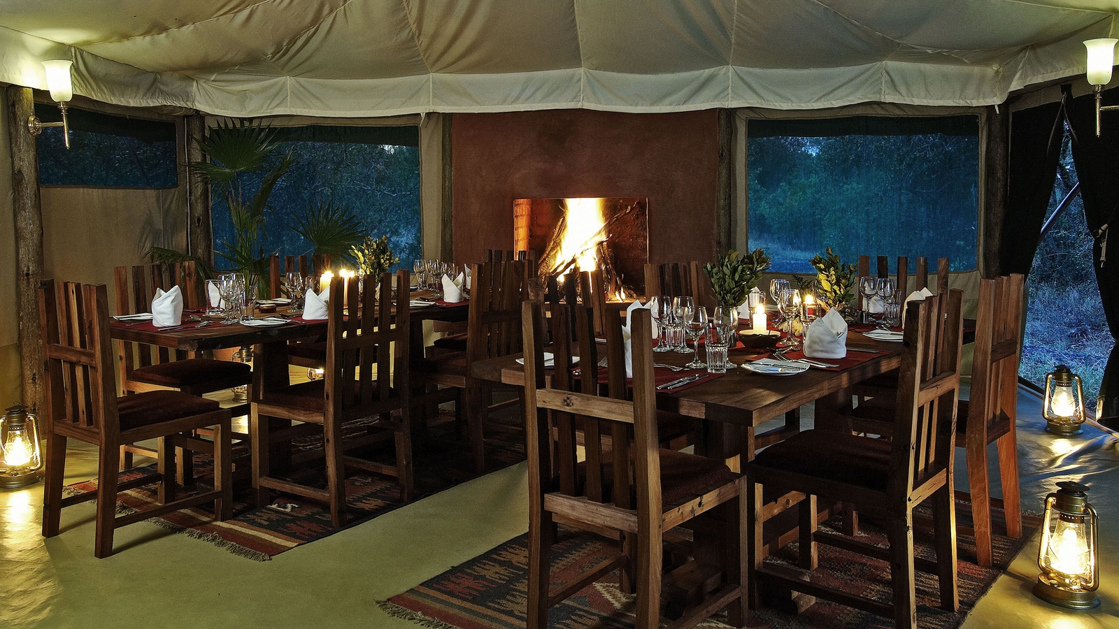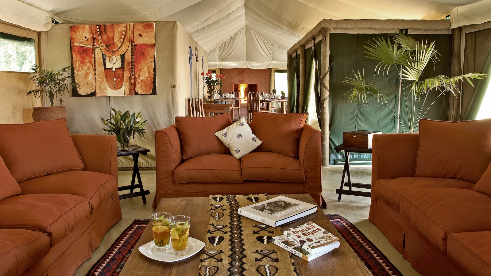 The camp itself has just six tented suites, with a verandah from which you can occasionally spot game at the dam, a magnet for wildlife during the dry season. A well-furnished lounge and dining tent have two roaring fires for the cooler evenings. Breakfast, lunch and dinner are often taken al-fresco and pre-dinner drinks and star gazing are a must under the great African sky.