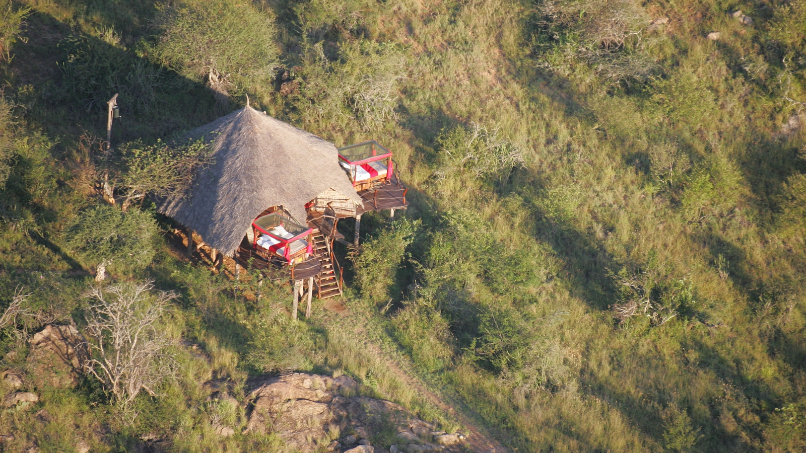 Handcrafted four-poster wooden beds sit on raised wooden platforms that jut from a thatched-roof room and are rolled out each night for guests to sleep under the endless African sky. There are four rooms, one of which has two double beds on separate platforms and is ideal for families. The rooms also feature a sitting area and open plan bathroom with similarly wonderful views.