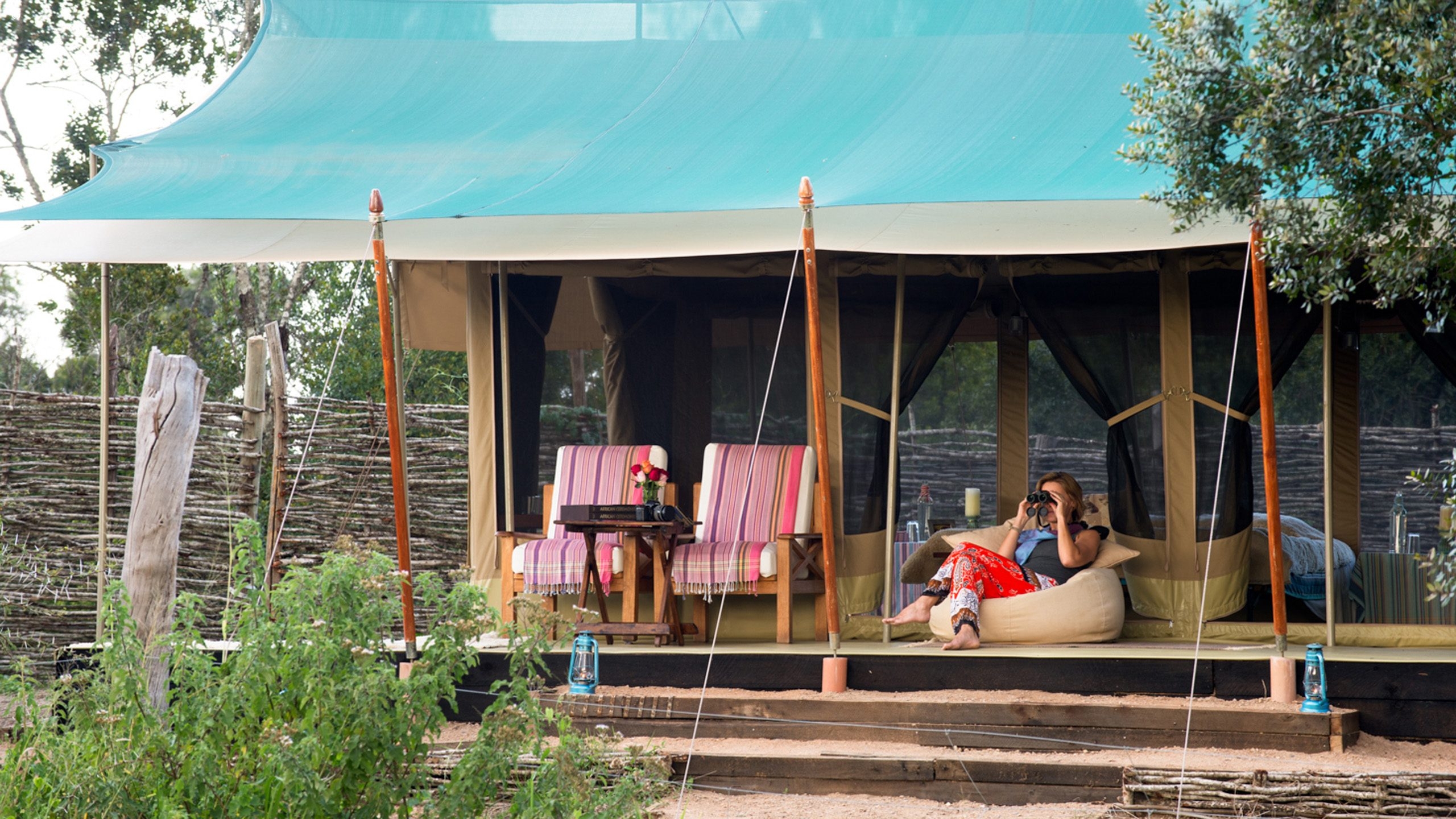 The two communal tents looking out over the sprawling plains are the hub of the camp. Meals are enjoyed under canvas in the dining tent, while the breezy mess tent with its inviting sofas and armchairs encapsulates the friendly, relaxed atmosphere in camp. When darkness falls, evenings are spent around the fire, waiting to catch a glimpse of a rhino ambling down to drink at the river.