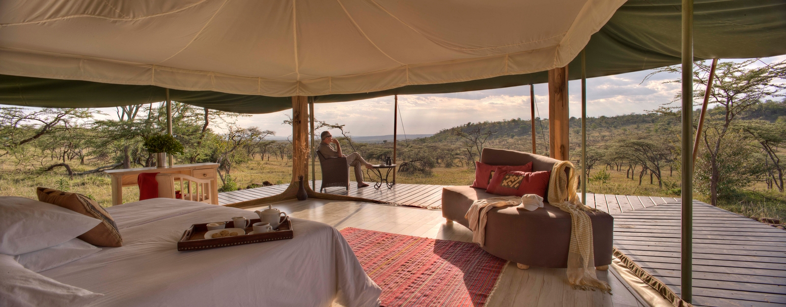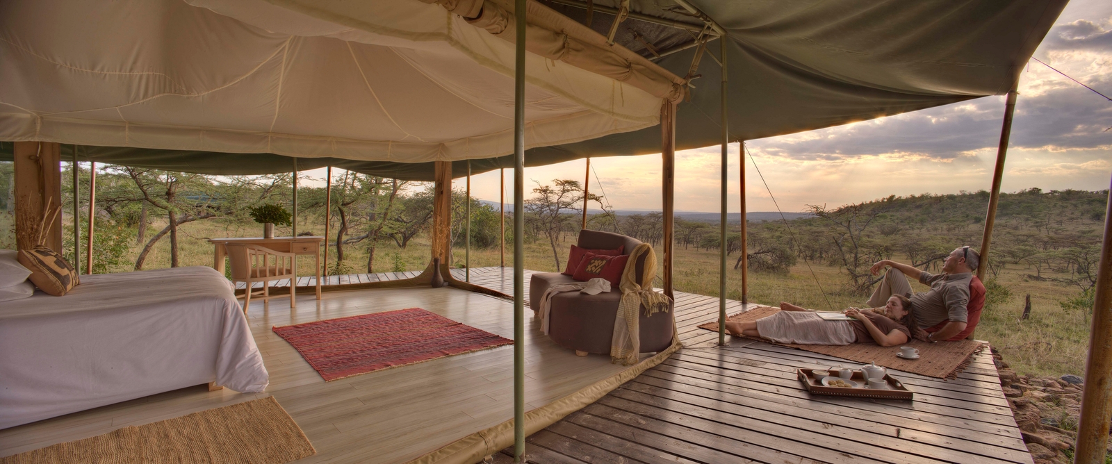 Meals are usually enjoyed al fresco a clearing overlooking the plains or, in the event of bad weather, in the communal lounge tent, which is also a delightful place to relax between game drives or other activities.