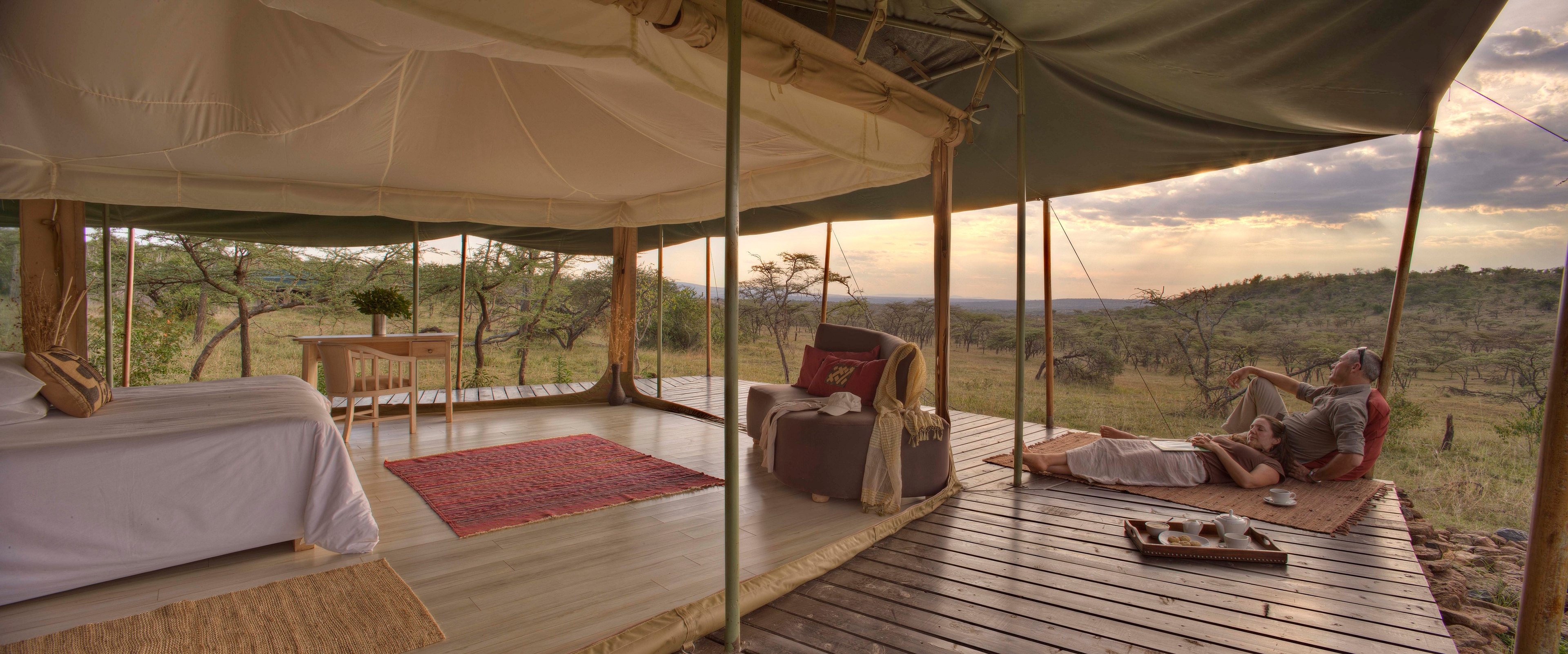 Meals are usually enjoyed al fresco a clearing overlooking the plains or, in the event of bad weather, in the communal lounge tent, which is also a delightful place to relax between game drives or other activities.