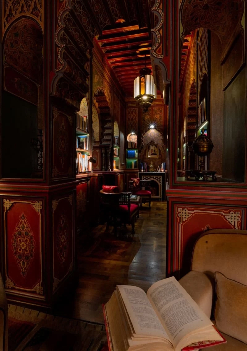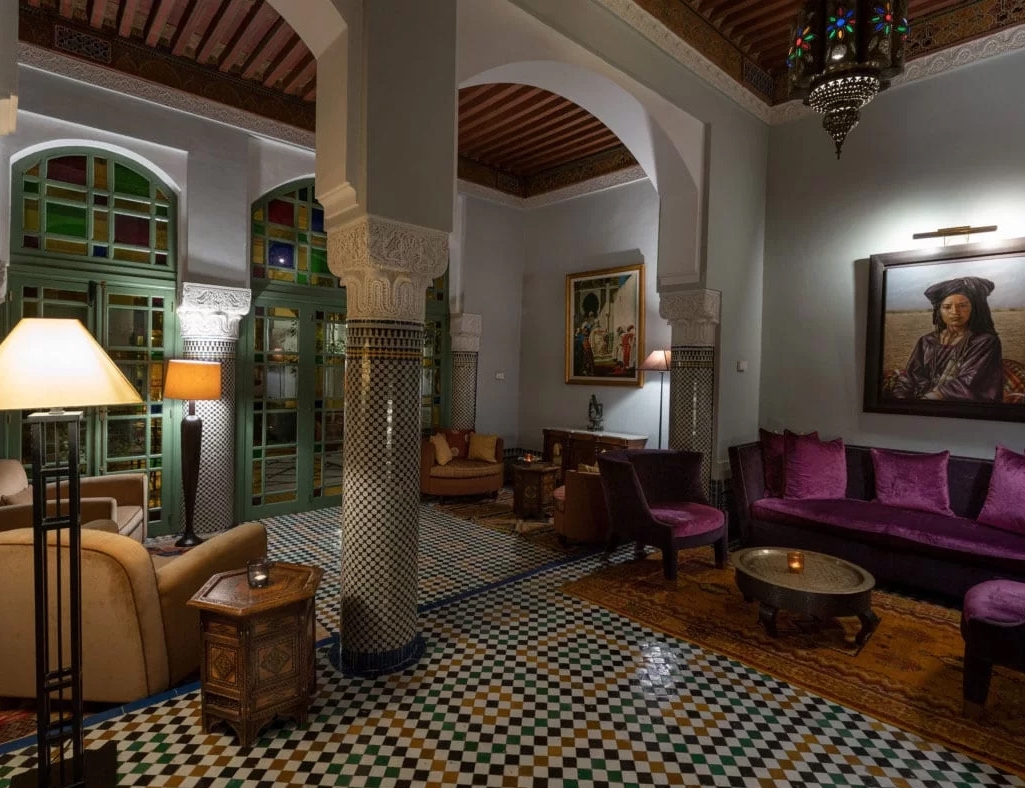 Palais Faraj is a a 19th century palace on a hilltop overlooking Fes’ medina below. Painstakingly restored over a number of years by a former architect to Hassan II of Morocco, its interiors are a celebration of Moorish crafts and design, with fine carving, tilework and bronze throughout.