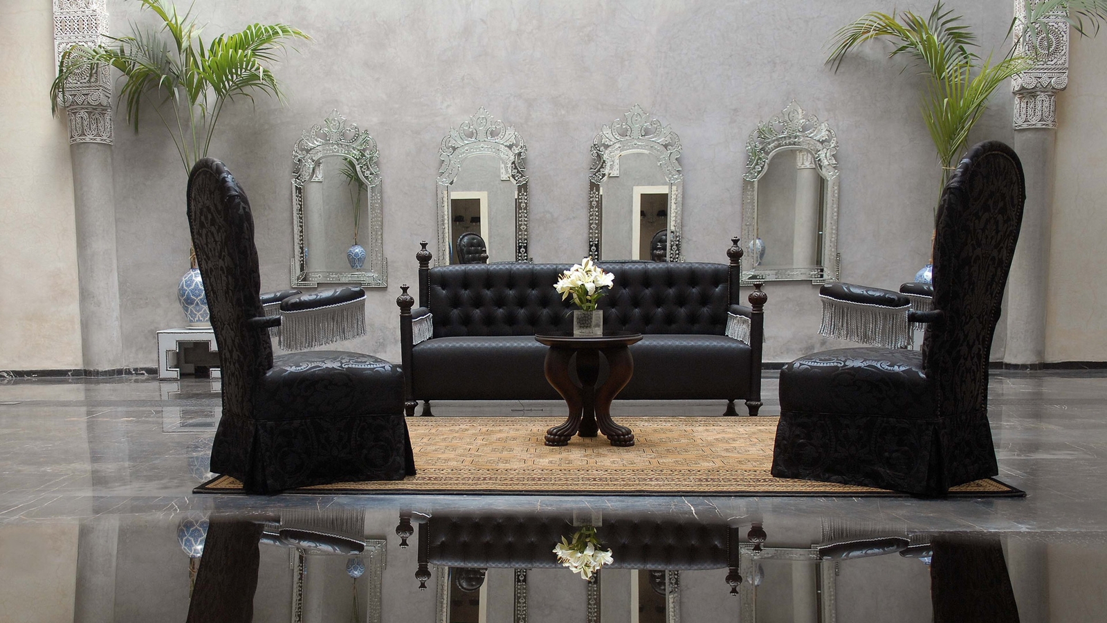 Four communal patios are distinctly styled in traditional, Moorish, Baroque, and contemporary finishes with colonnaded arcades, stylish pools, zellige tiles and fine stuccowork.