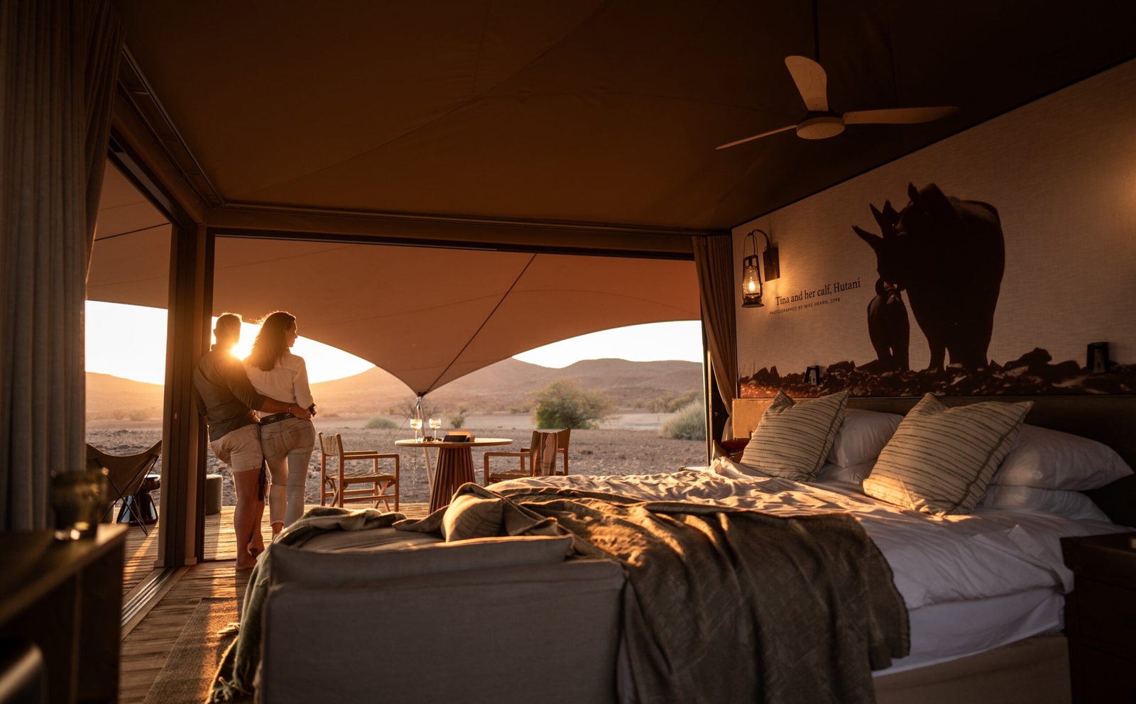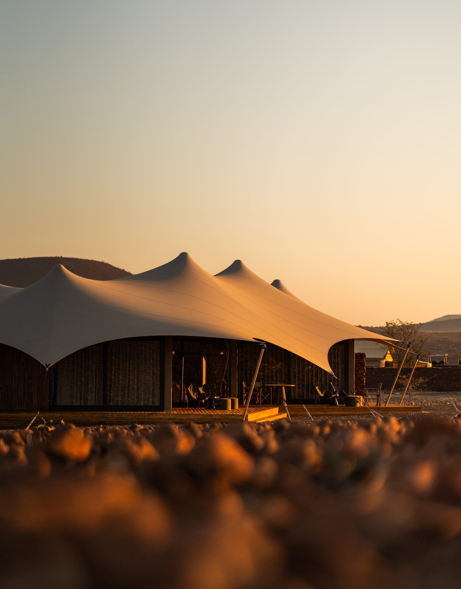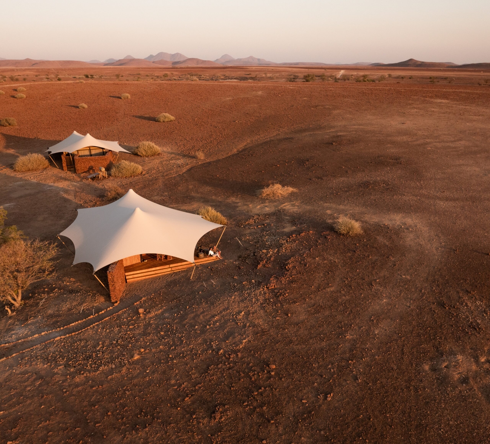 Lodging at the camp is divided between eight raised Meru-style canvas tents with front verandas that take in expansive landscape of the dramatic Etendeka Mountains and the plains scattered with euphorbia and ancient welwitschia plants. The tented dining and lounge areas have also been elevated to provide panoramic views during meal times and moments of relaxation. There’s also an attractive pool to cool off in and a fire pit for enjoying nights spent stargazing and swapping tales.