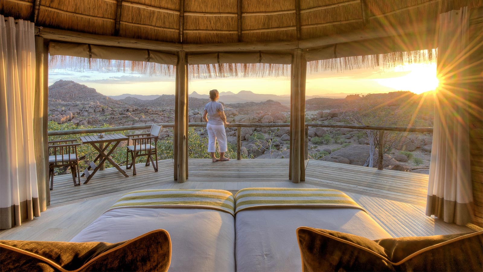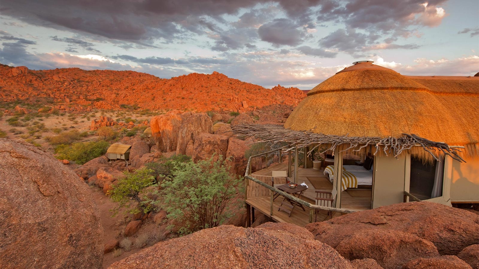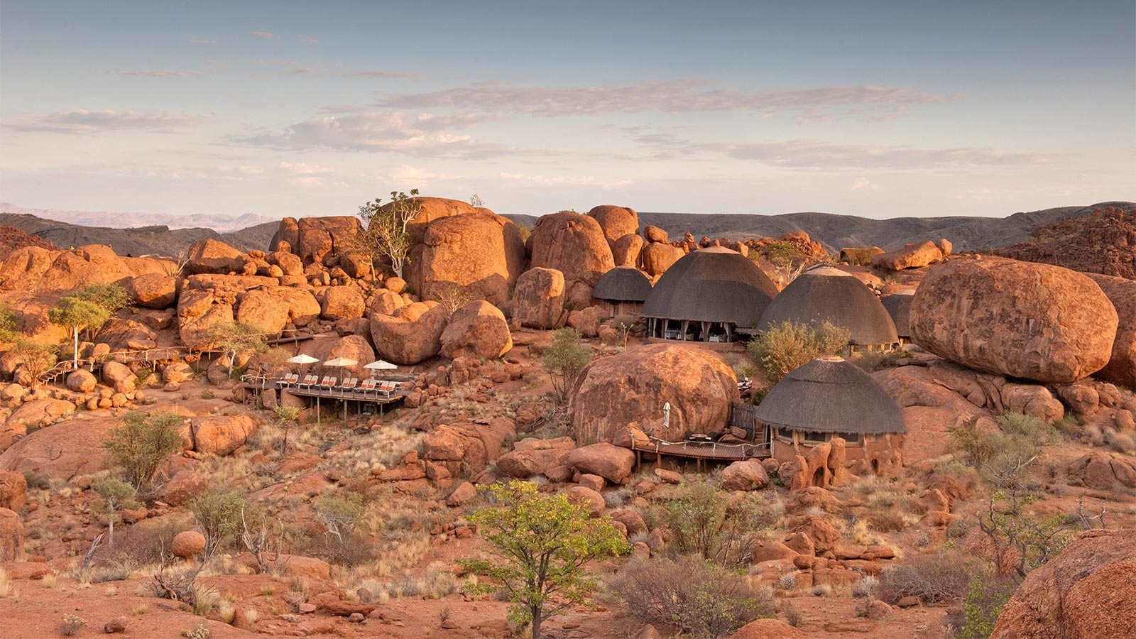 Grouped together like a typical African village in squeezed between huge rust-coloured boulders of the Twyfelfontein Conservancy, Mowani is an imaginative and sustainable eco-lodge with astonishing desert views.