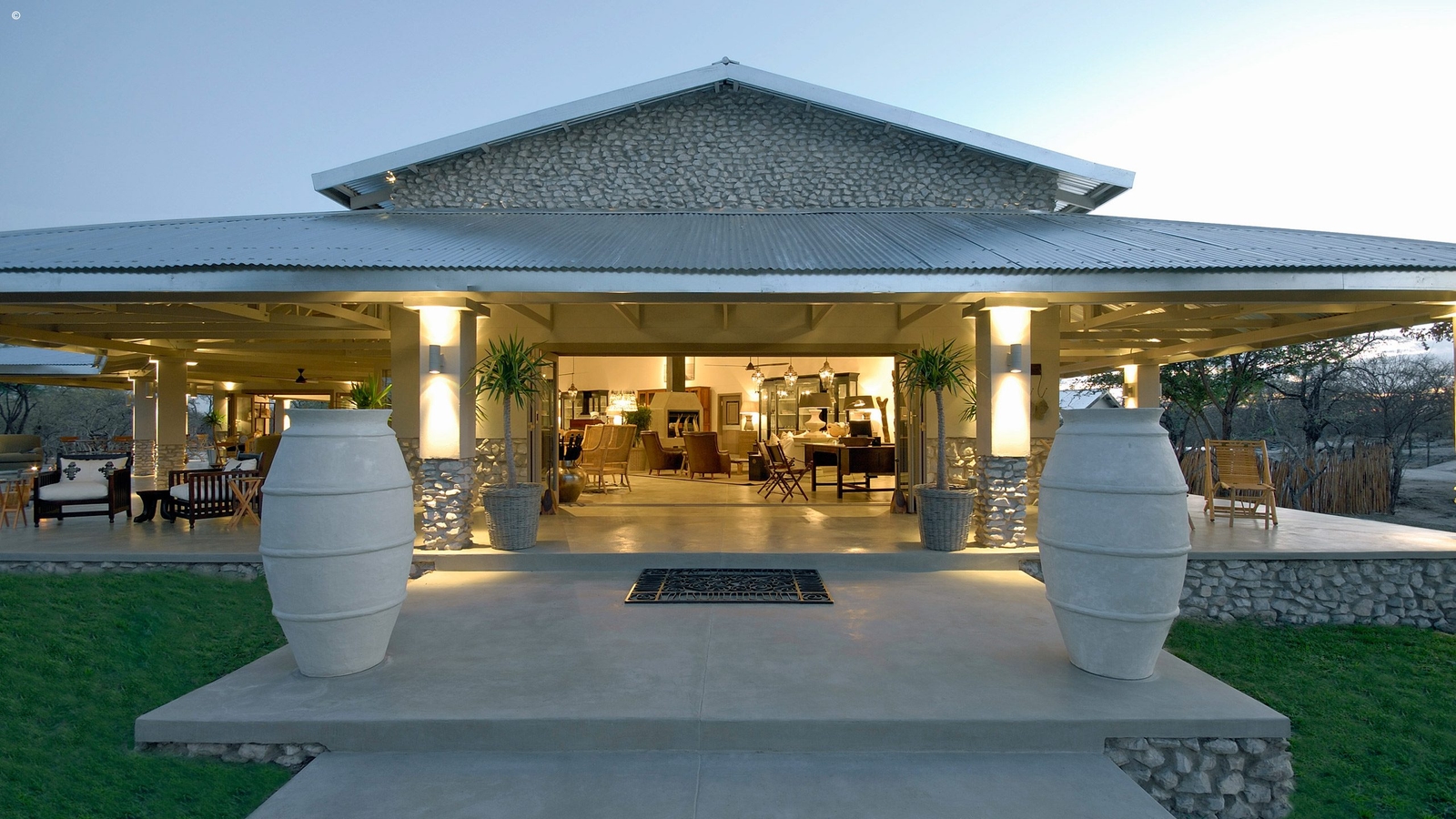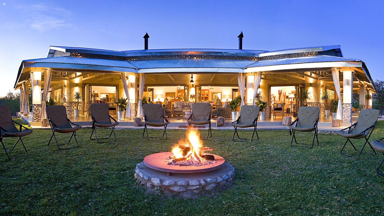 Main Lodge area with dining tables, camp fire, lounge and bar