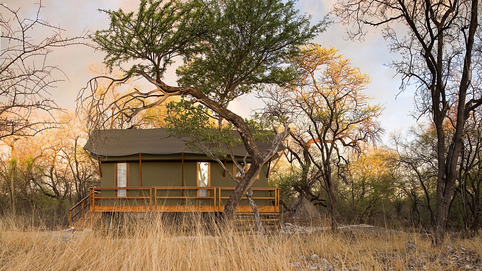 A modern, and certainly chic, option is Mushara’s Outpost property. Styled on an old farmhouse with a more minimalist take on the open plan safari lodge, the effect is elegantly up to date and sleek. Positioned along the ancient dry riverbed of the Omuramba, their sixteen standalone canvas and wood rooms are raised by stilts on individual wooden platforms for extra privacy and elevated views over the bush.
