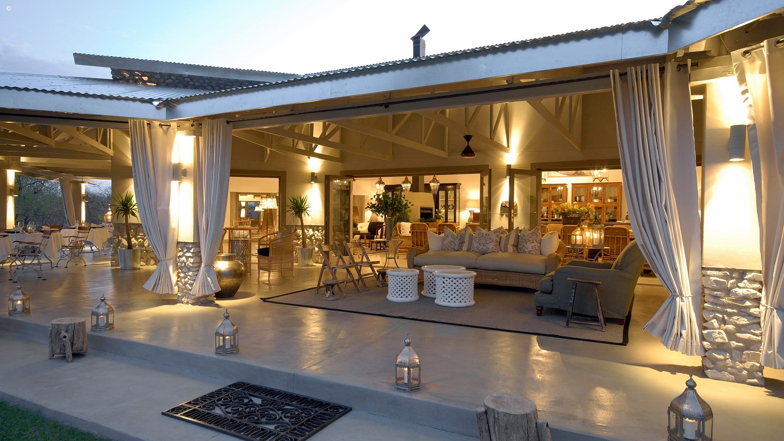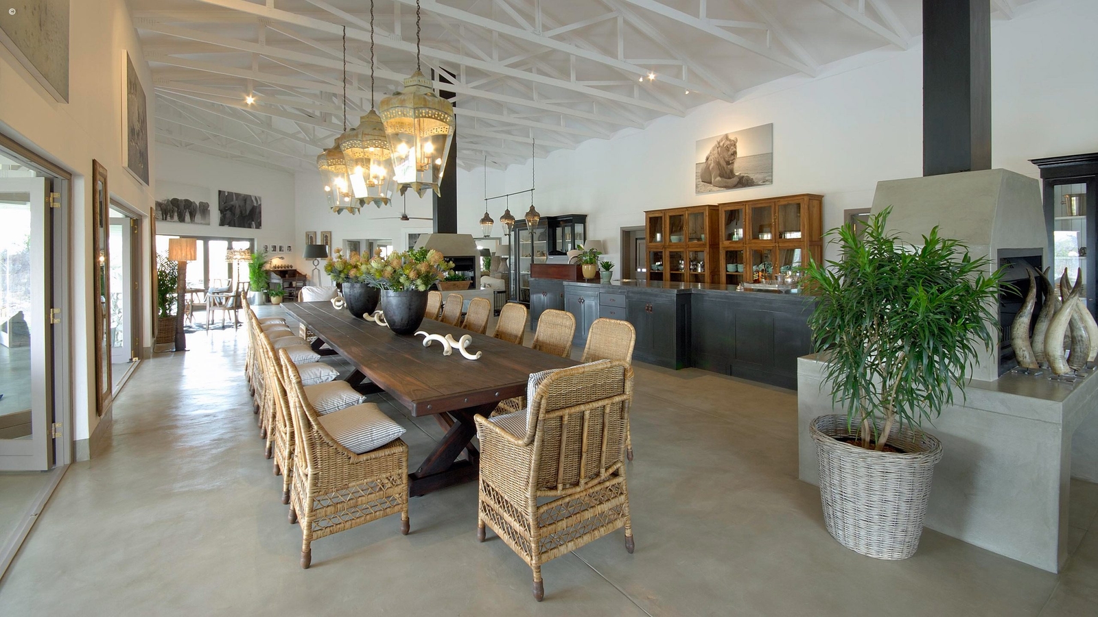 Main Lodge area with dining tables, camp fire, lounge and bar