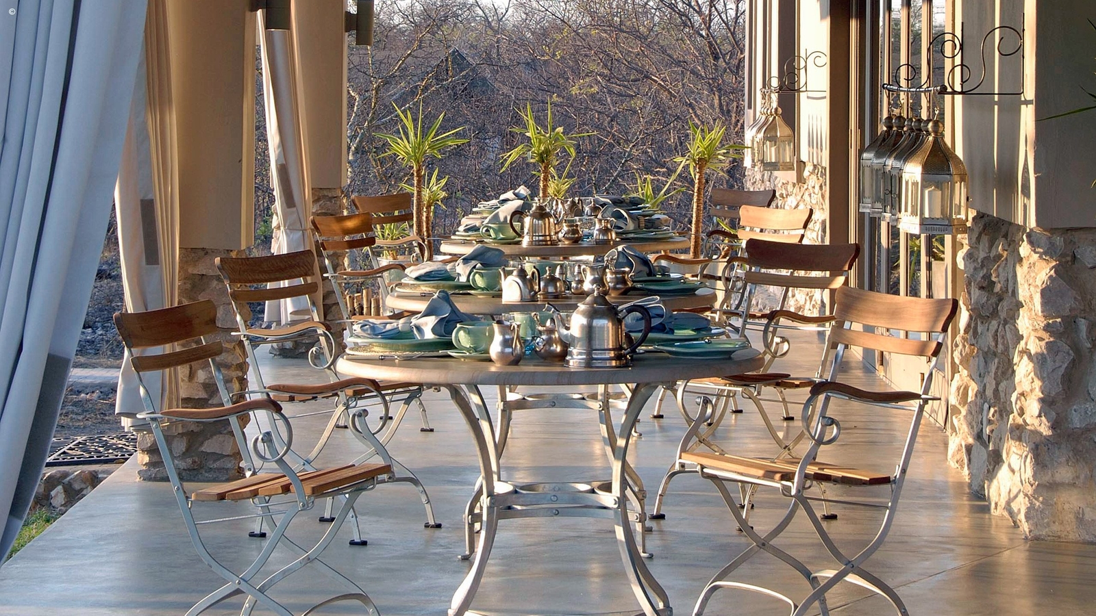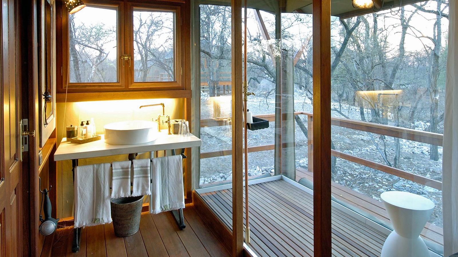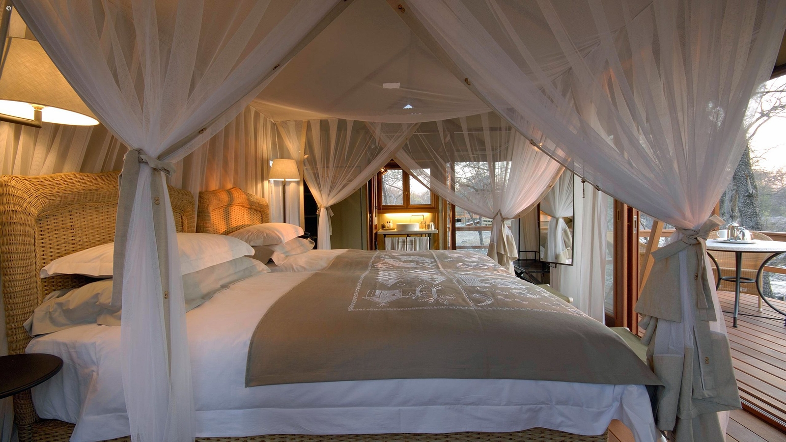 A modern, and certainly chic, option is Mushara’s Outpost property. Styled on an old farmhouse with a more minimalist take on the open plan safari lodge, the effect is elegantly up to date and sleek. Positioned along the ancient dry riverbed of the Omuramba, their sixteen standalone canvas and wood rooms are raised by stilts on individual wooden platforms for extra privacy and elevated views over the bush.