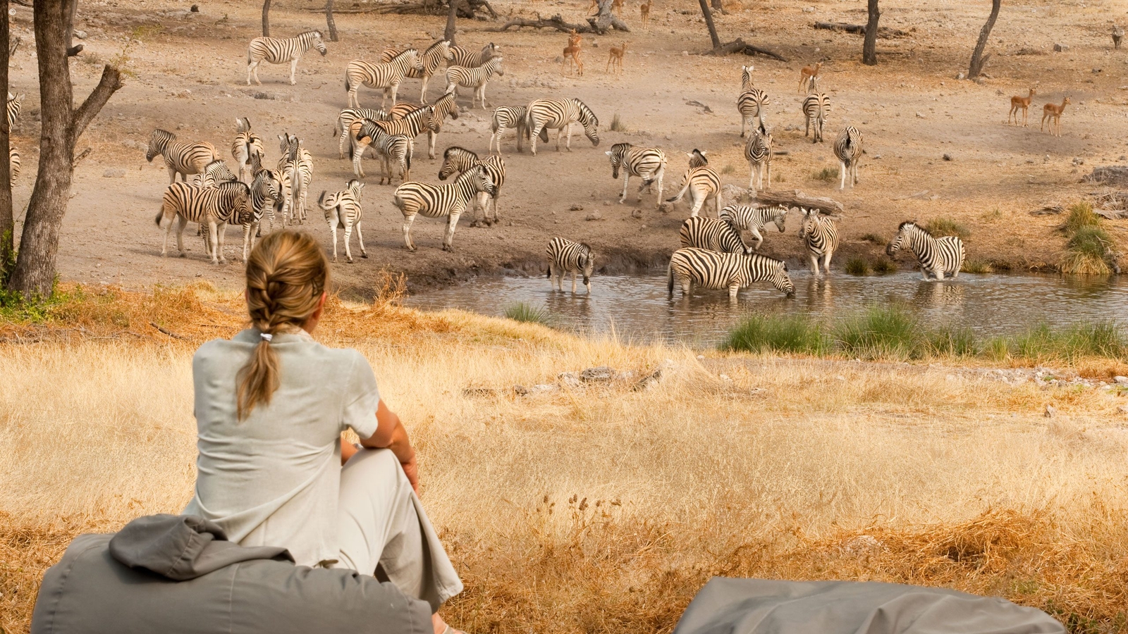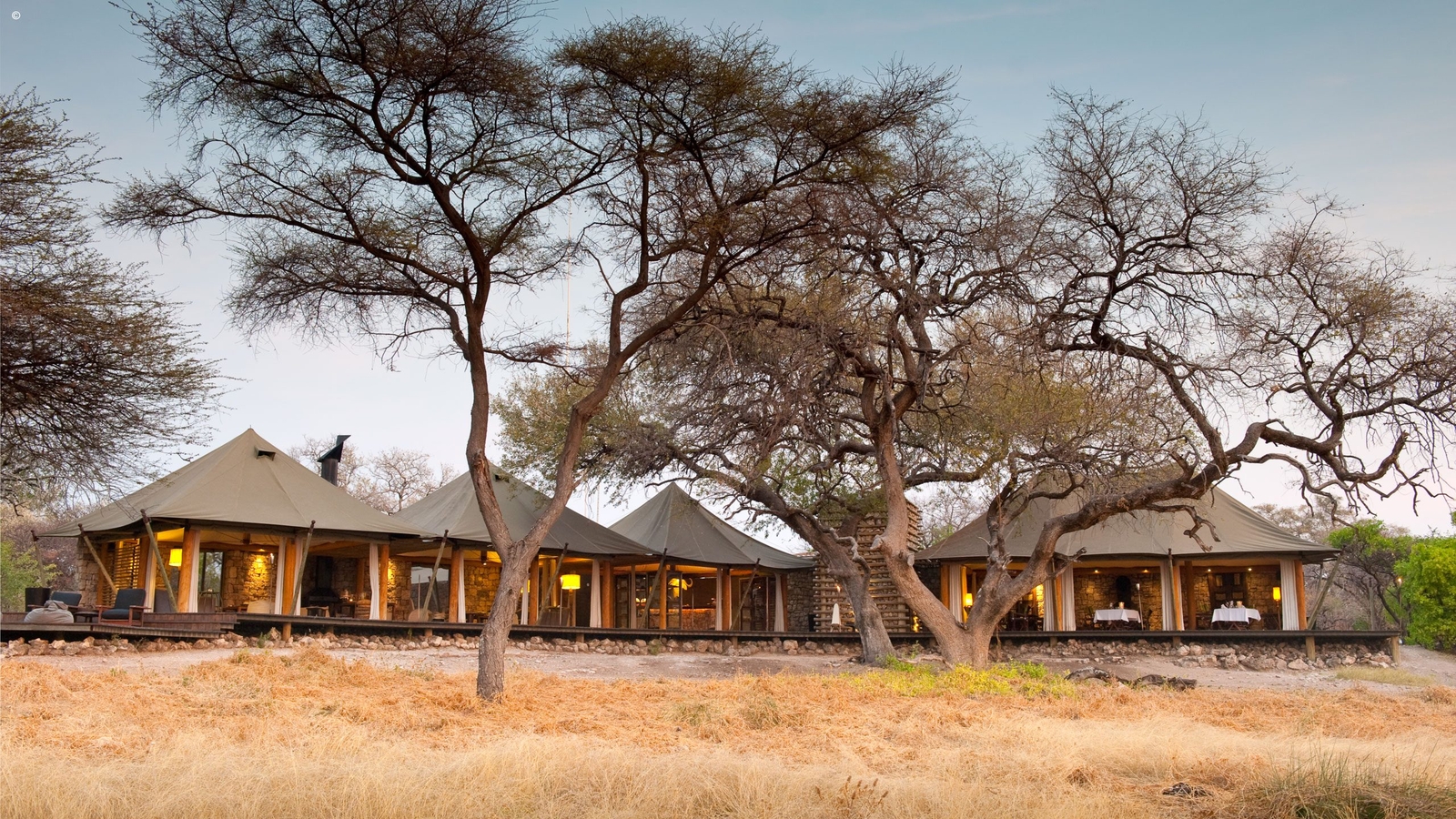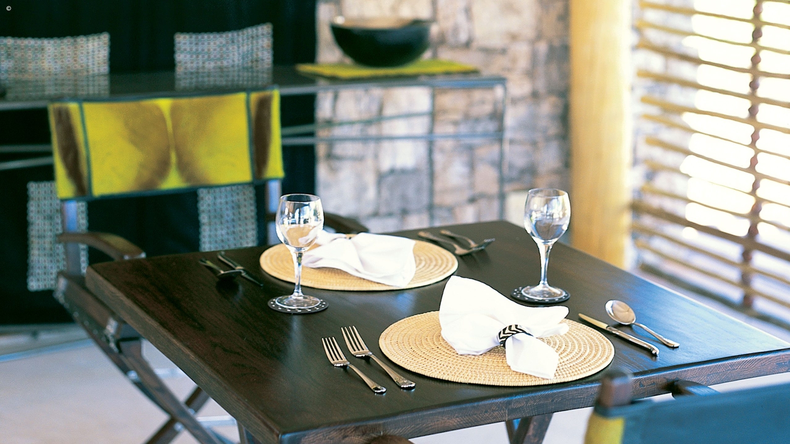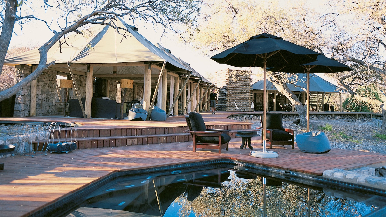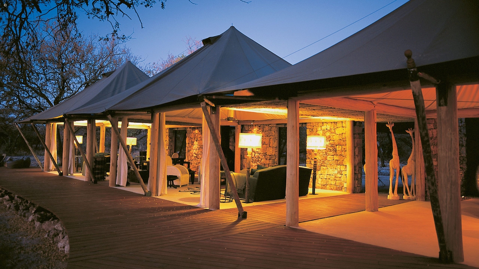 Dinner is served under a thatched roof with completely opened sides, allowing guests to watch the floodlit waterhole while they dine on delightful safari cuisine. Giraffe, antelope, zebra and the occasional lion are known to visit the waterhole.