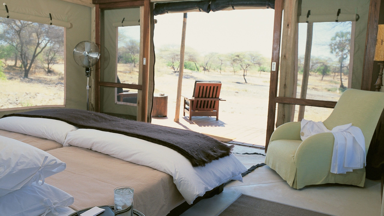 Stylish, natural sophistication is employed throughout the camp, including the rooms that each feature en-suite bathrooms with a bath and outdoor shower. Each of the seven exquisitely styled tents are on a raised platform with a large private deck that overlooks the waterhole.