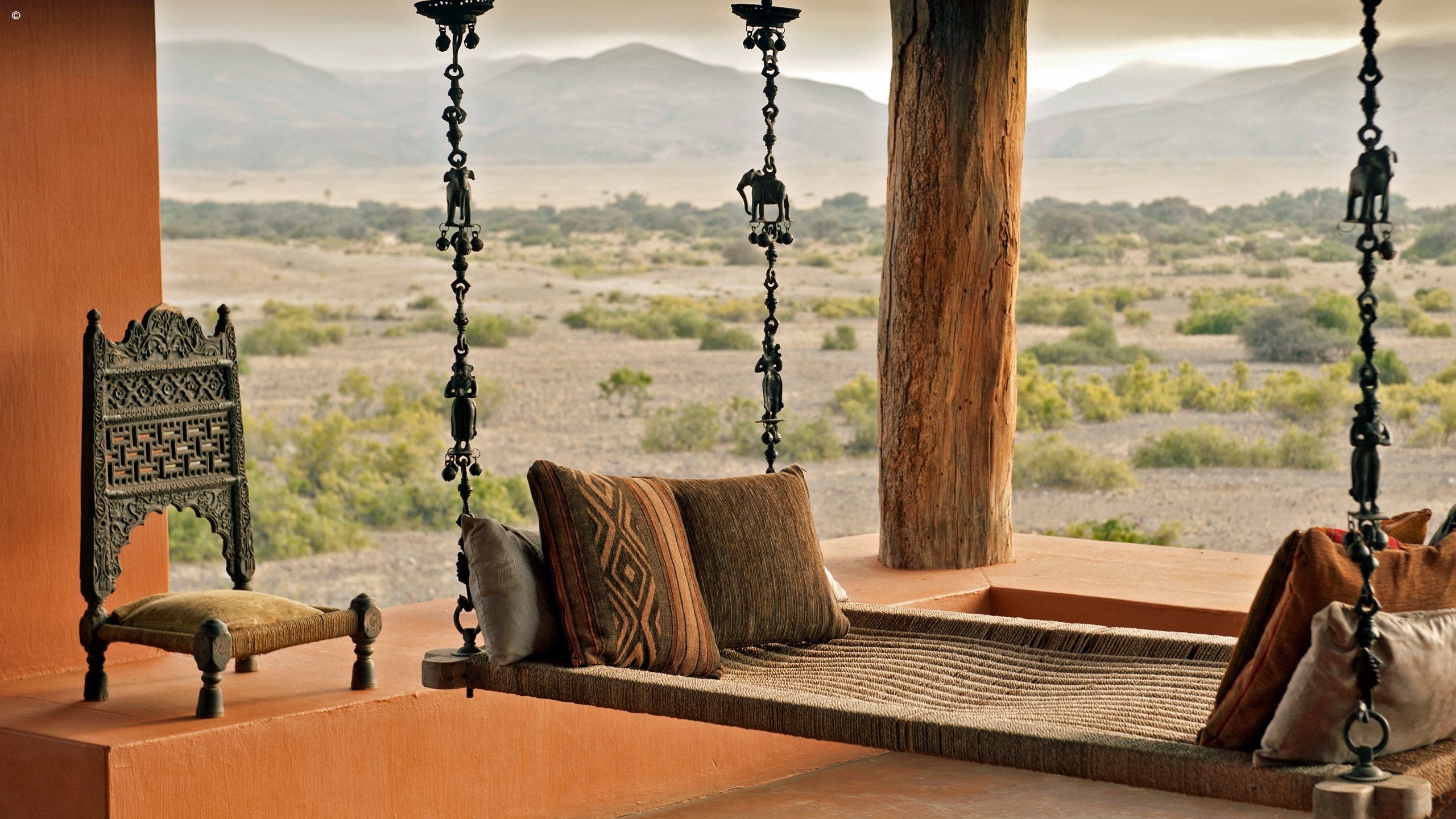 One of the most striking things about the Okahirongo Elephant Lodge are the views you get from every angle that you sit, stand or lie. Even from your bathtub you get scenes of the Hoarusib River below, the jagged outlines of the Purros Valley mountains in the distance sometimes accompanied by the remote roar of desert lion.