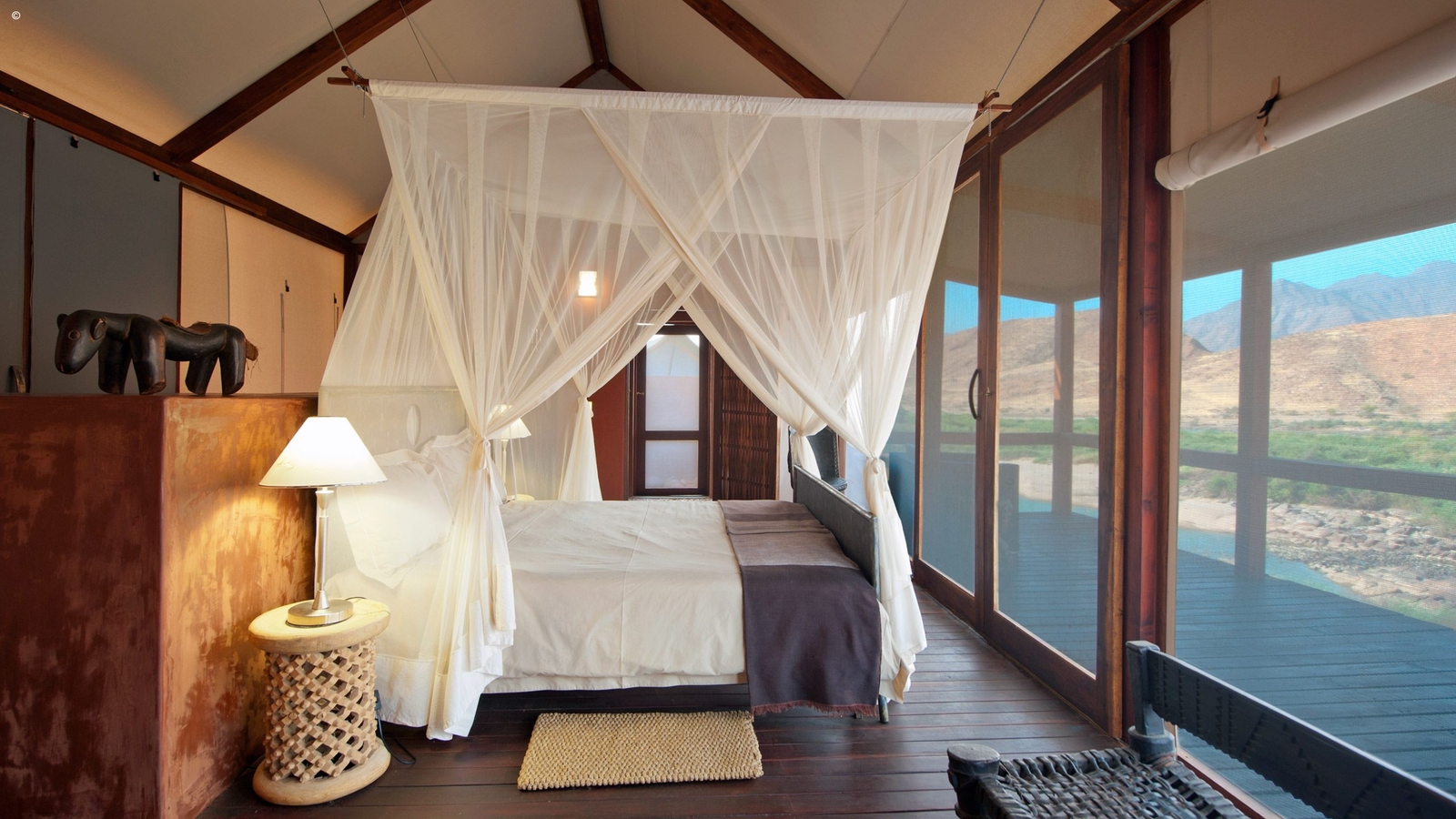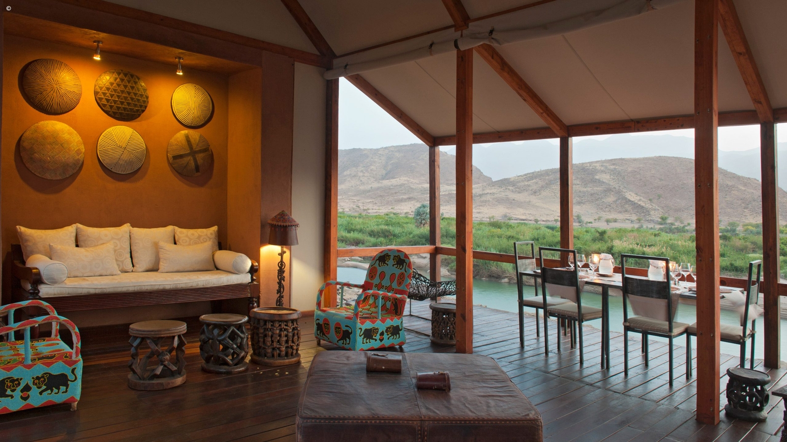 Scaling a ridge in the Marienfluss Valley and its central lodge built above the rapids of the Kunene, this is wild luxury at its best. The views are staggering with the colours constantly shifting into new ones depending on the time of day. Seven standalone wood and canvas rooms envelop you in the arid beauty at the same time delivering fine linen, a private terrace, indoor and outdoor showers, and a naturally stylish and eco-friendly ambience.