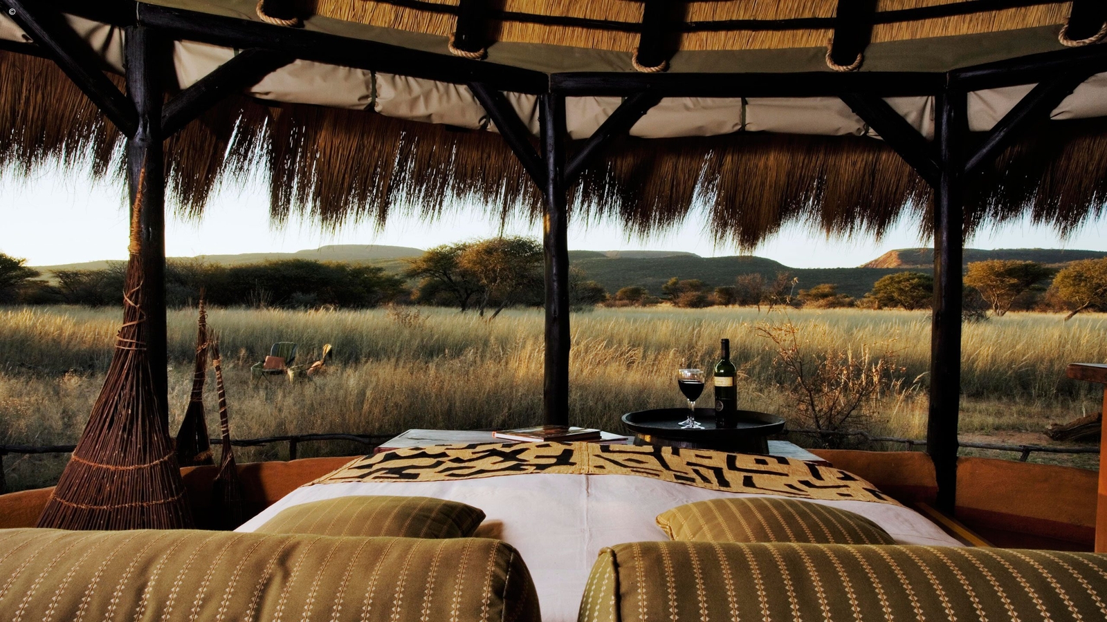 Dressed in a mix of earthy, khaki and ochre colours, the accommodation echoes its surrounding scenery. Pull up the front of your canvas room to reveal stunning bush views and unique birdlife that feed at your chalet’s birdbath. Continue the wildlife encounters on exhilarating walking trails and game drives to spot antelopes, oryx and a flourishing population of rescued cheetah and leopard.
