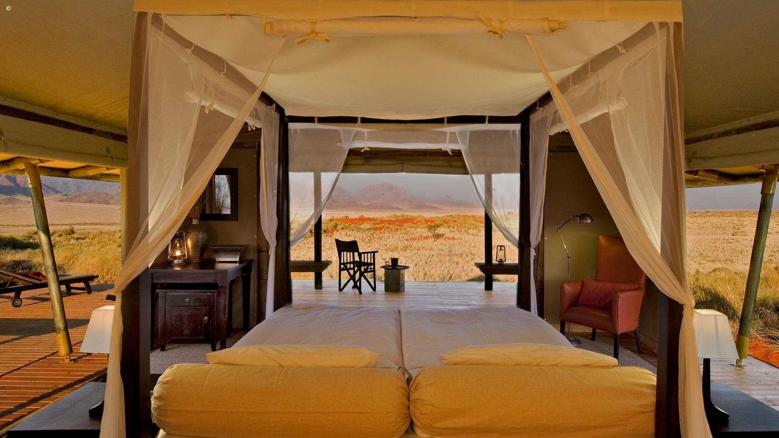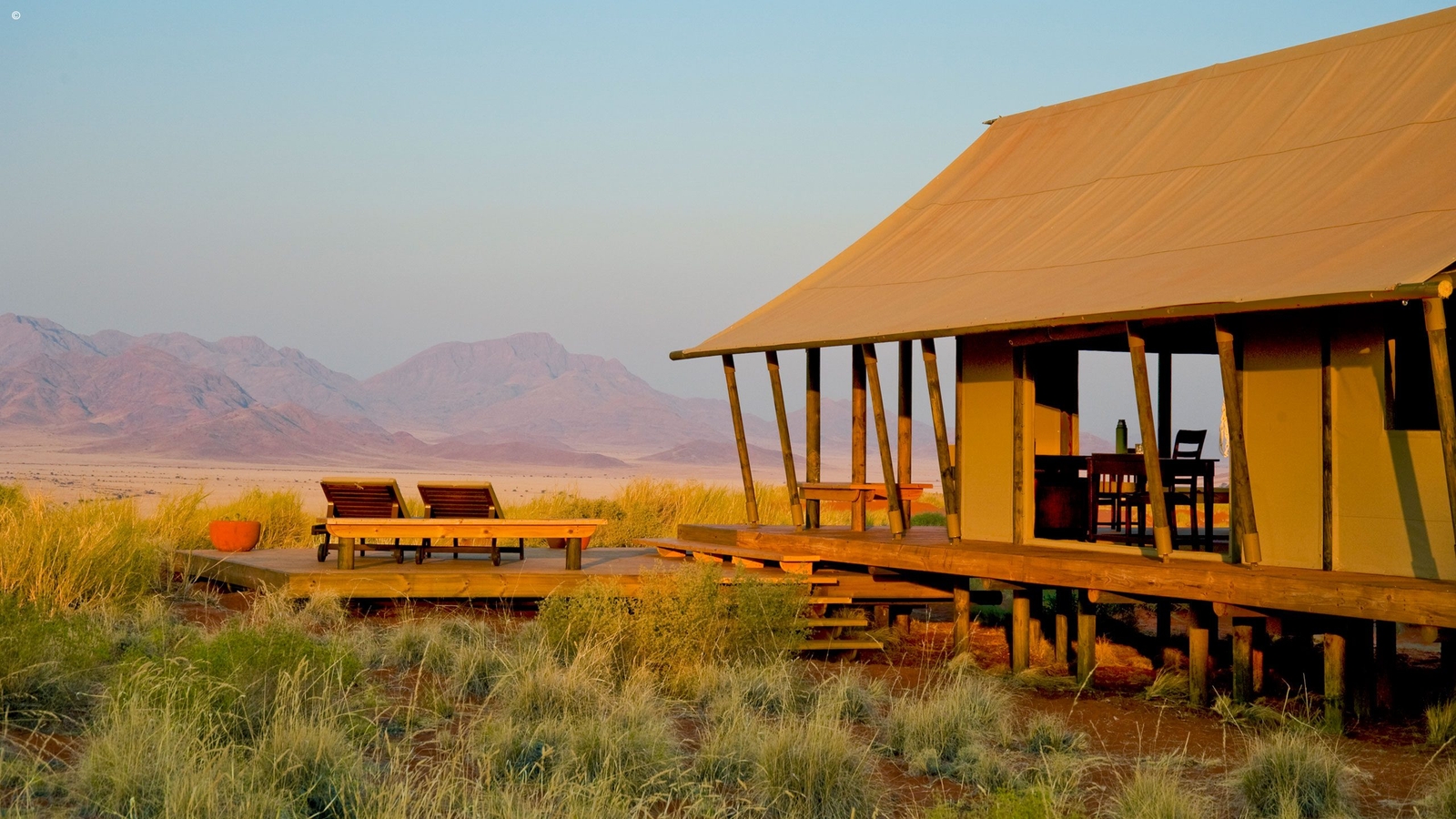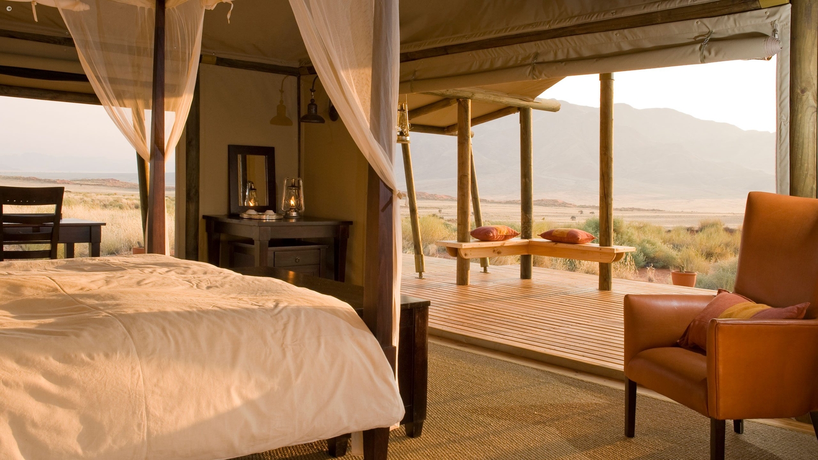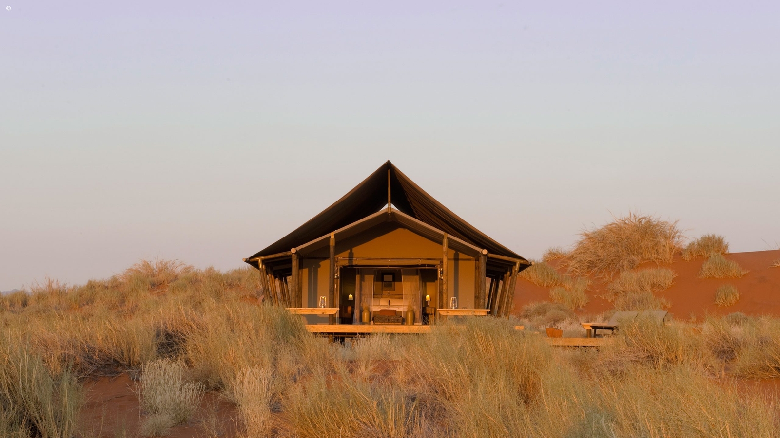 The camp is located on top of a 250-foot sand dune lending it spectacular views and a pristine setting. Each tent sits on a wooden platform with its own private bathroom and a deck that overlooks the expansive desert and the star-littered night sky. Canvas windows can be rolled up for unrestricted views and desert breeze for an authentic safari feel.