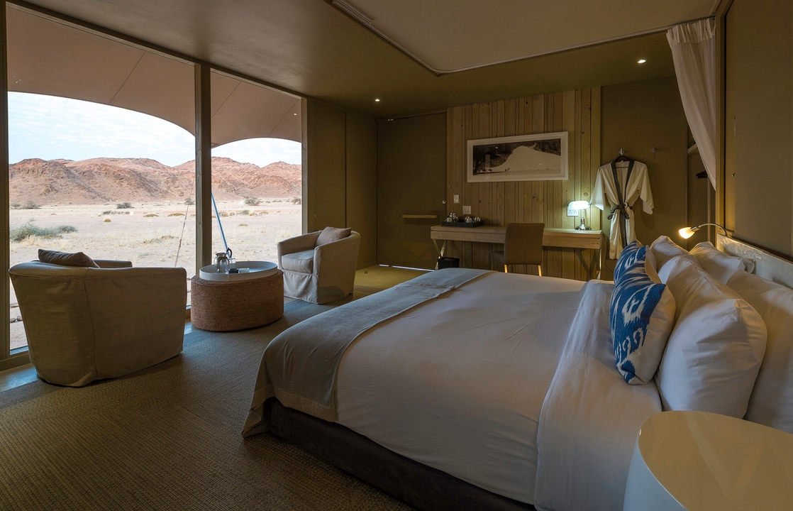 You’ll get a feel for the exclusivity and wonderful remoteness of your accommodation as you fly in by light aircraft – the only way to access the camp. The imitate, luxury tented camp consists of just seven twin-bedded suites and one family unit, each complete with shaded outdoors decks from which to contemplate the valley’s starkly stunning, moon-like landscape.