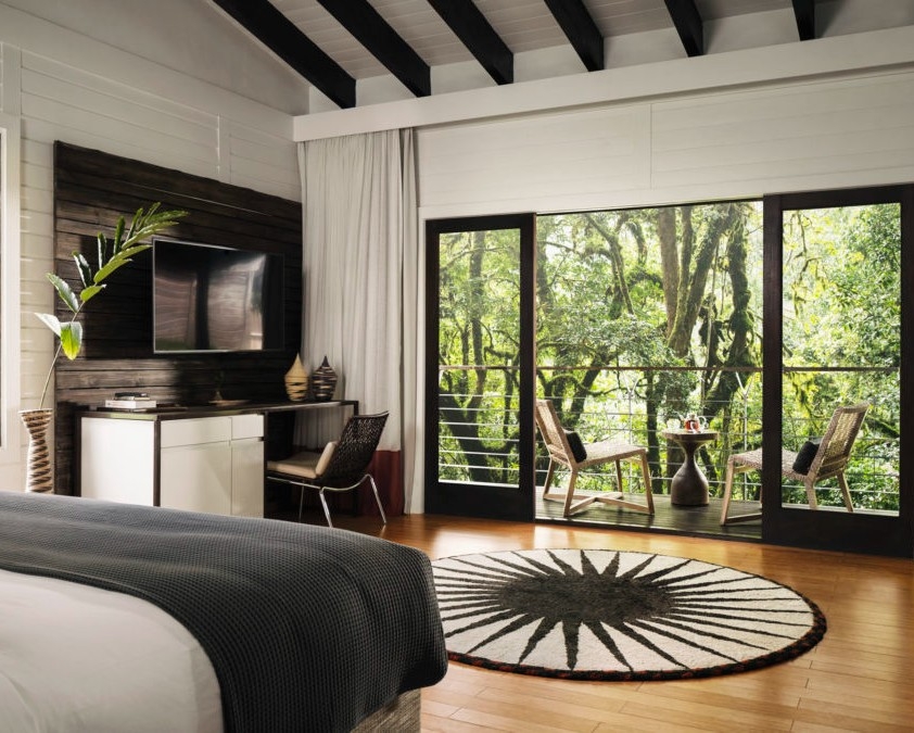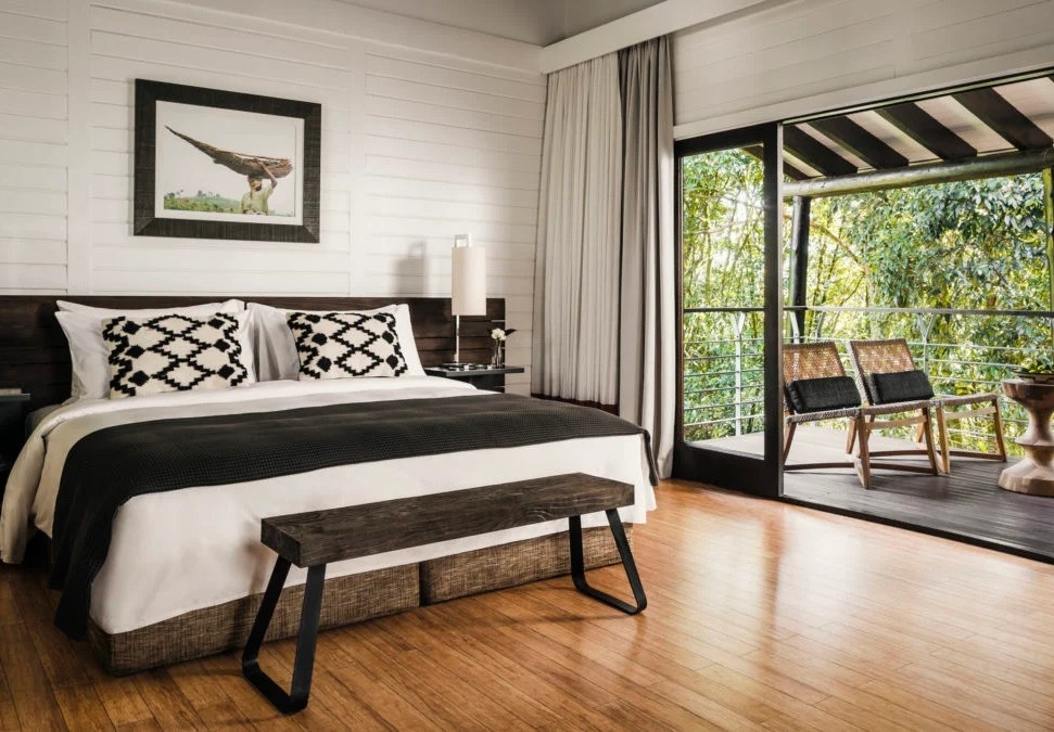 There are 22 rooms and suites split between six wooden villas, with vast windows and private decks opening up into the forest. There are open fireplaces in each and every room and suite, with interiors and artwork inspired by the nature and traditions of Rwanda.