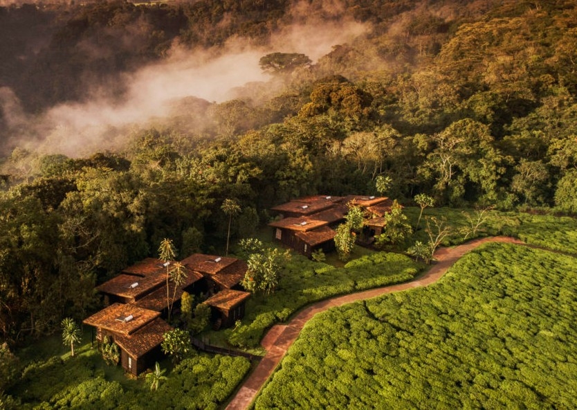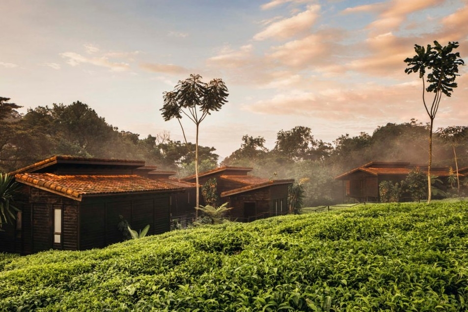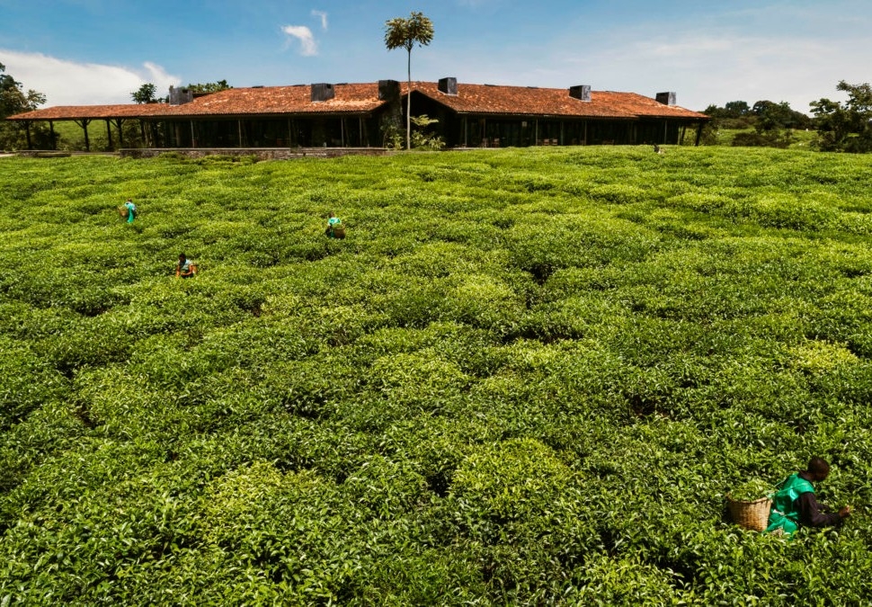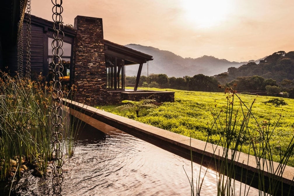 Low and wide amid the leaves of its very own tea plantation surrounded by ancient rainforest, Nyungwe House’s modern architecture is a wonderful contrast to its verdant setting.