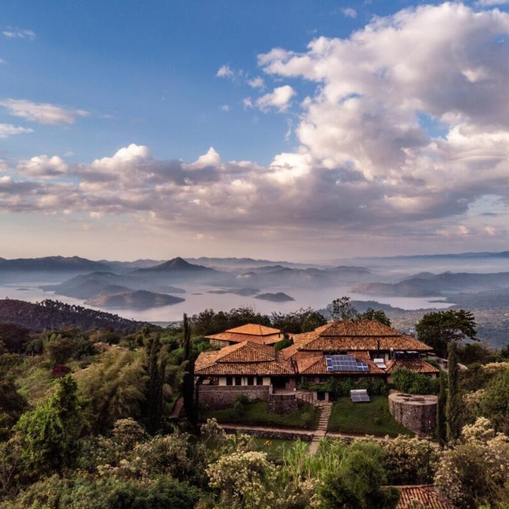 The lodge sits atop a 2,300-metre hilltop with panoramas of the ‘twin lakes’ of Ruhondo and Bulera and the string of Virunga volcanoes laid out in front of you.