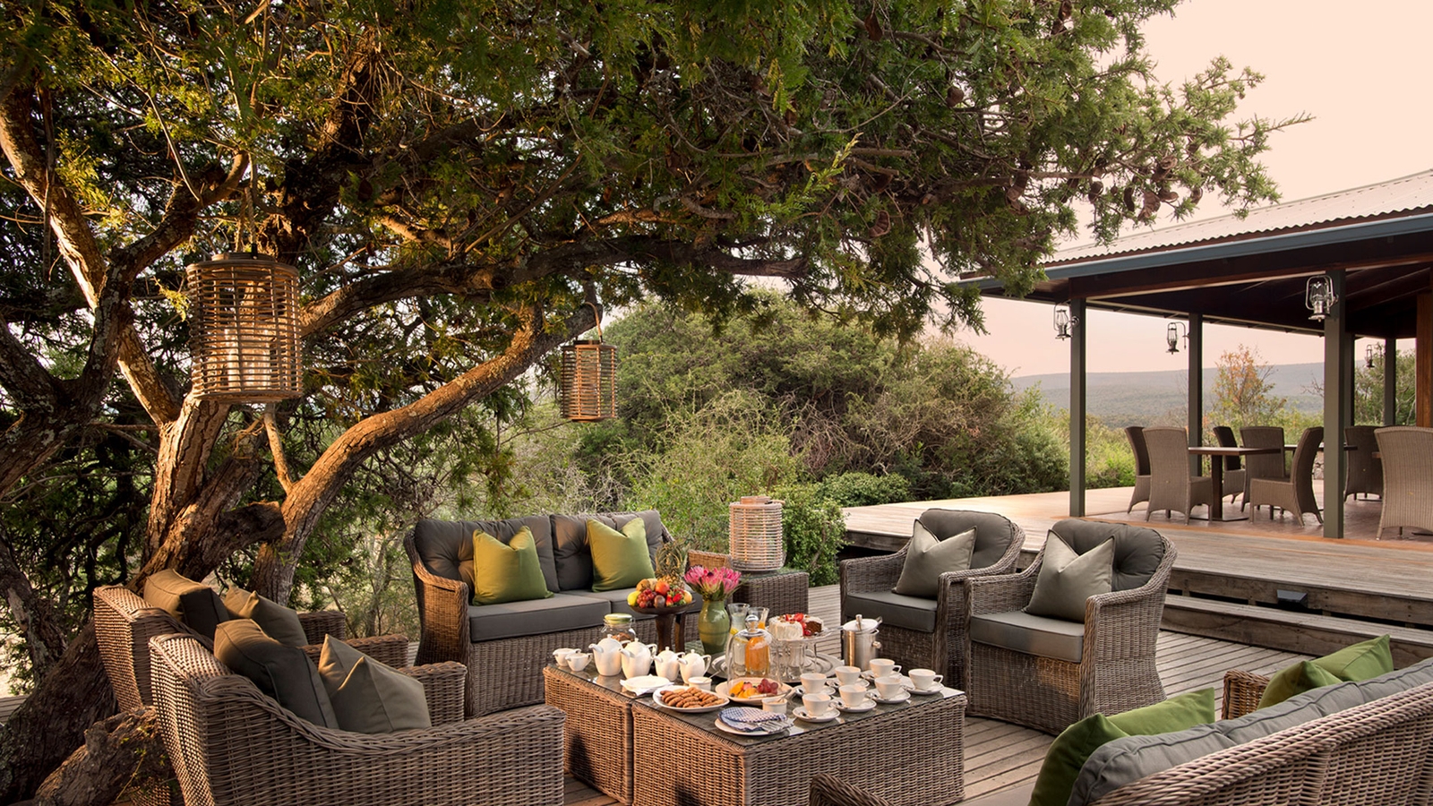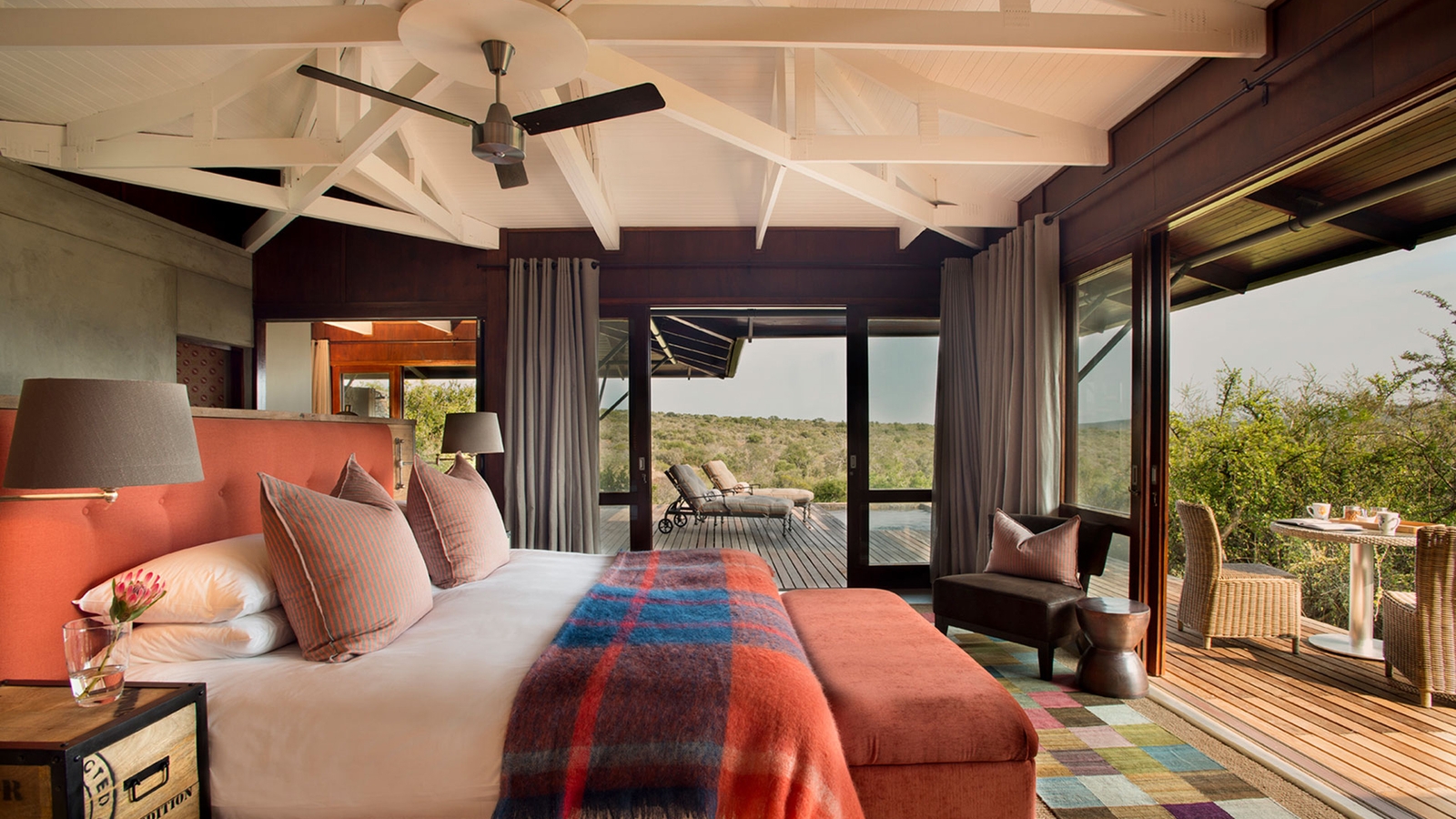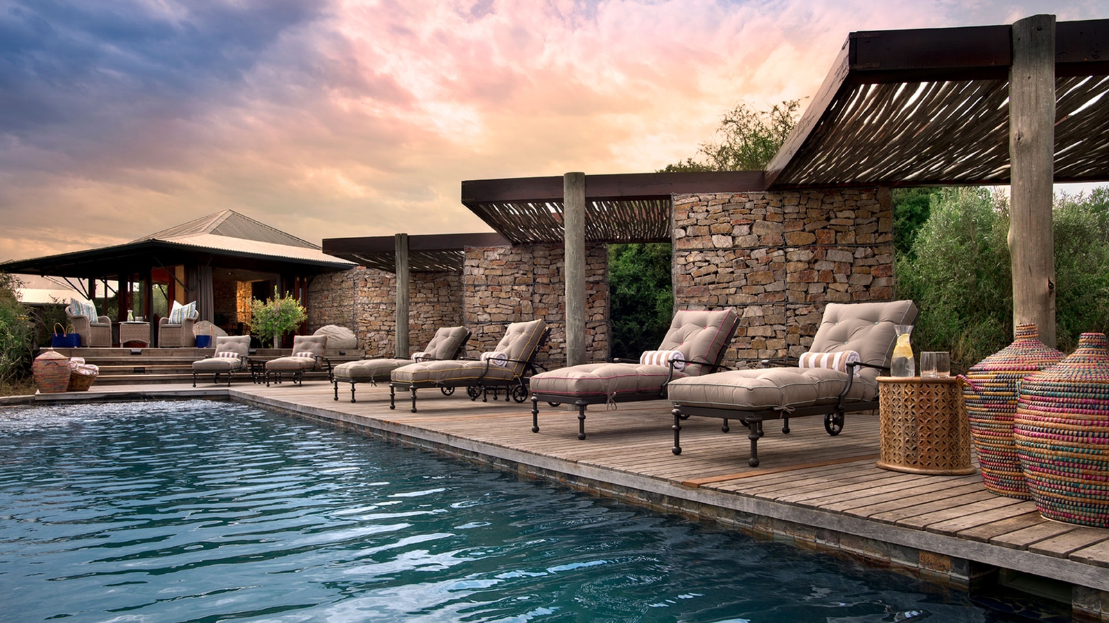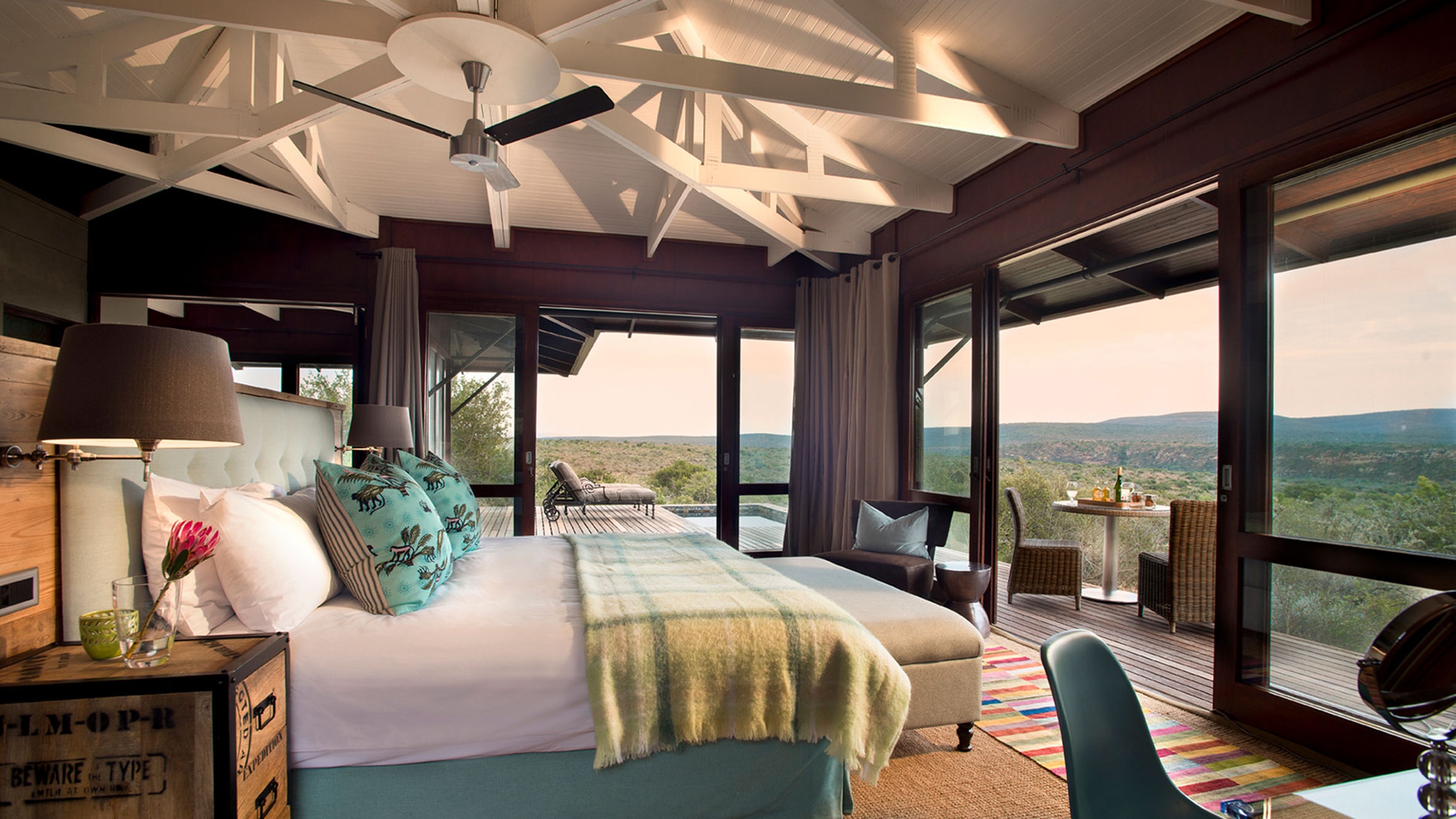 Six rooms are surrounded by wraparound timber decking, private plunge pools and a scenery of Kwandwe Private Game Reserve’s rolling hills thick with acacia and aloe trees.