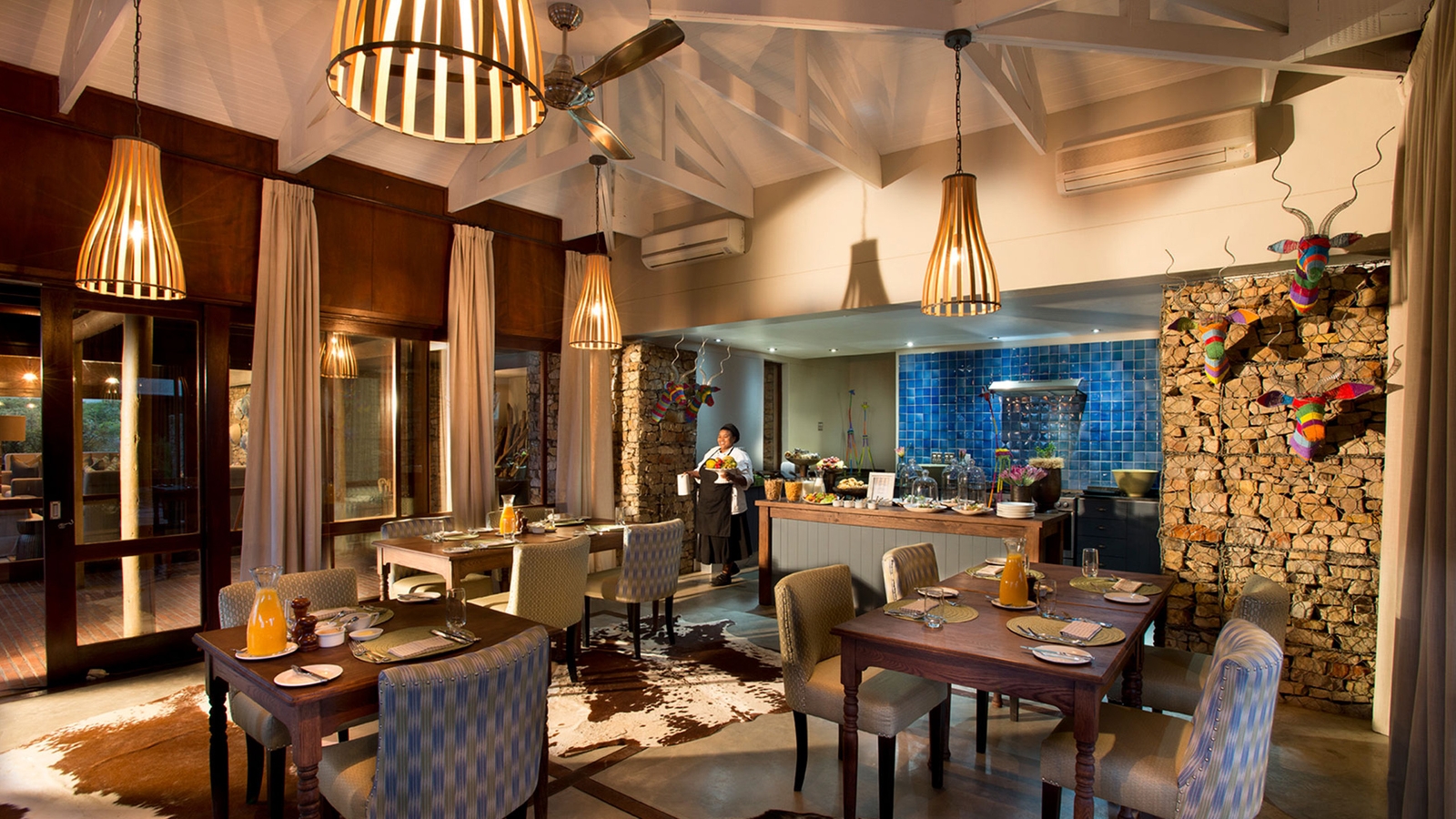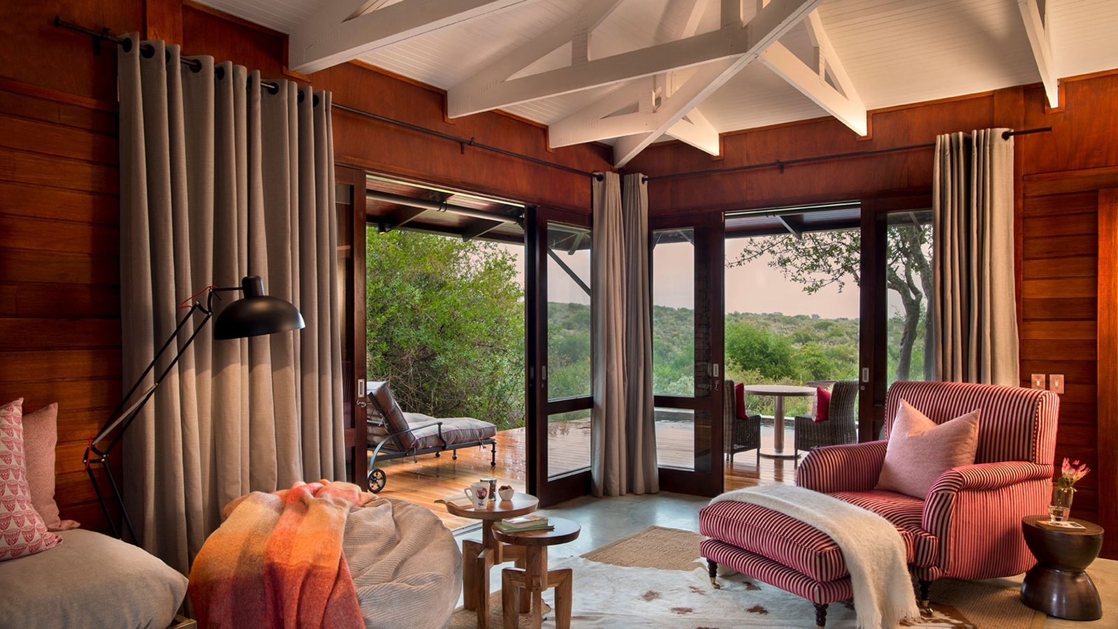 You don’t often use the word ‘trendy’ to describe a safari lodge but Ecca, with its funky 1950s-style suites, pop art, vibrant flashes of colour, seamless architectural lines and pagoda-style corrugated iron roof, really is.