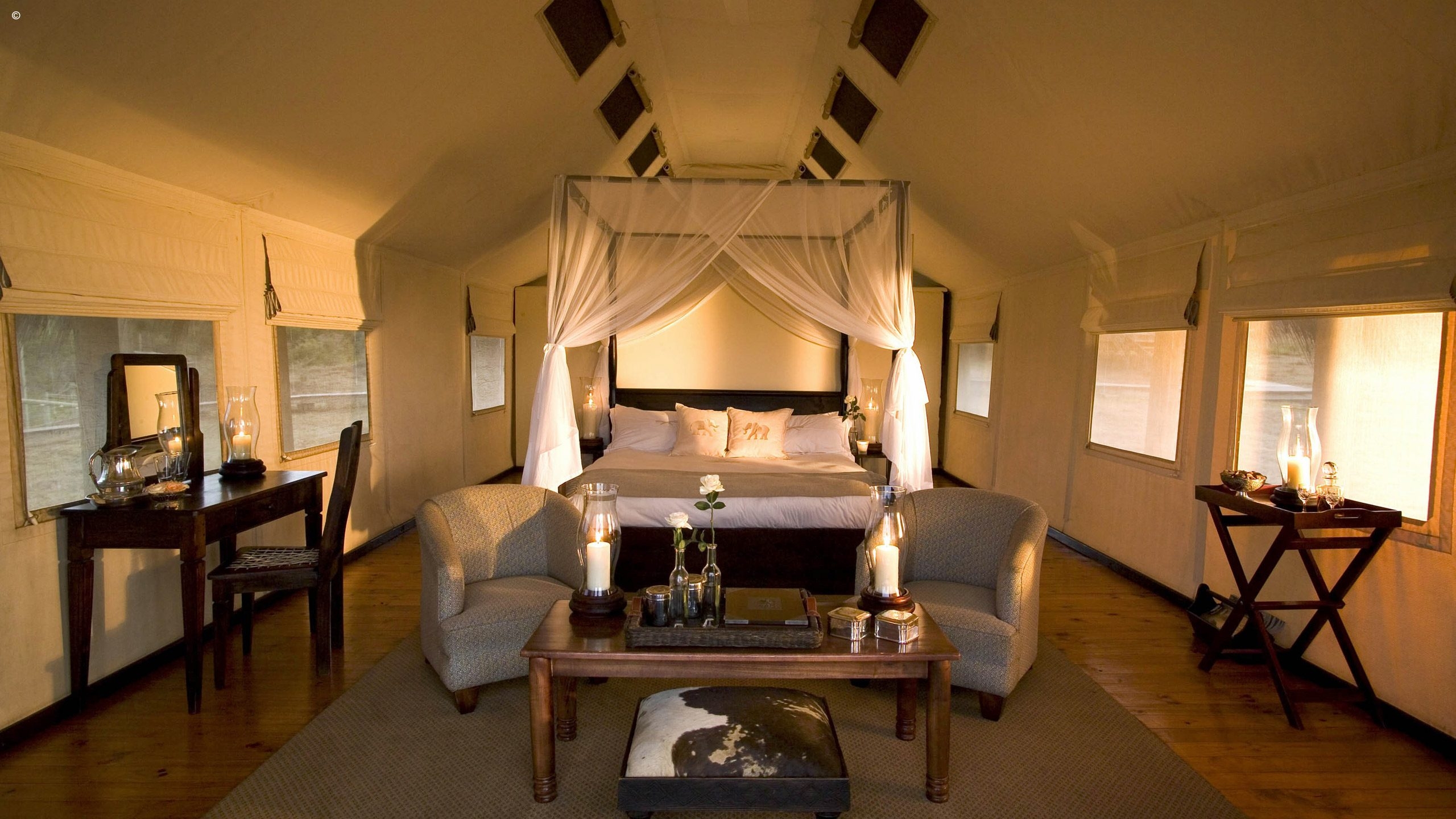 Its eleven tented suites have been dressed in the period grandeur of the pioneer age with four poster beds slung with soft awnings, collapsible table trays, oil lamps, crystal decanters and huge showers. Also the camp is an electrics-free zone, so no electrical appliances exist in the suites or main lodge.