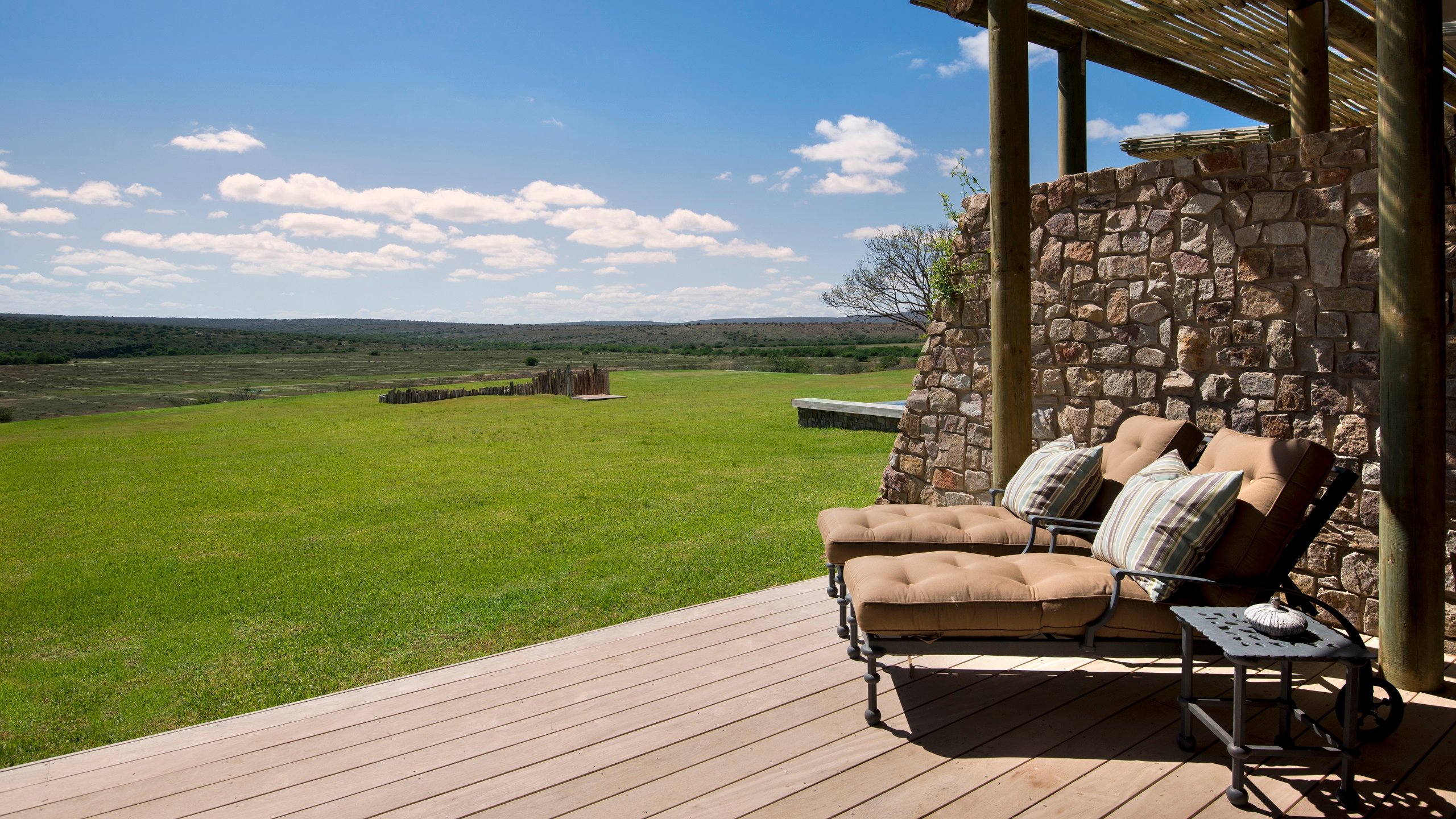 Six rooms are surrounded by wraparound timber decking, private plunge pools and a scenery of Kwandwe Private Game Reserve’s rolling hills thick with acacia and aloe trees.