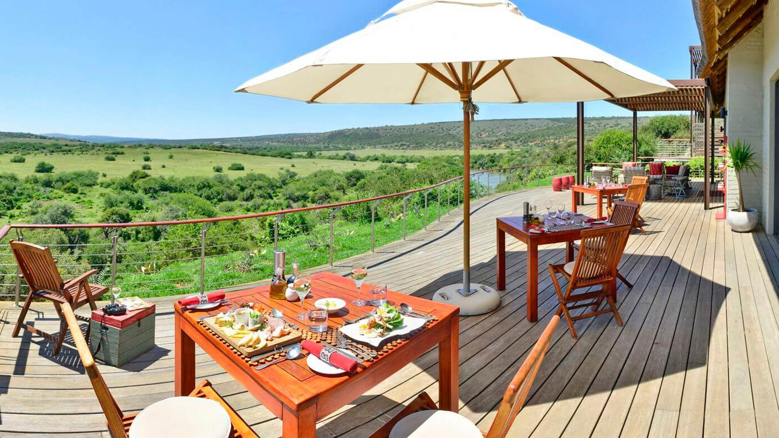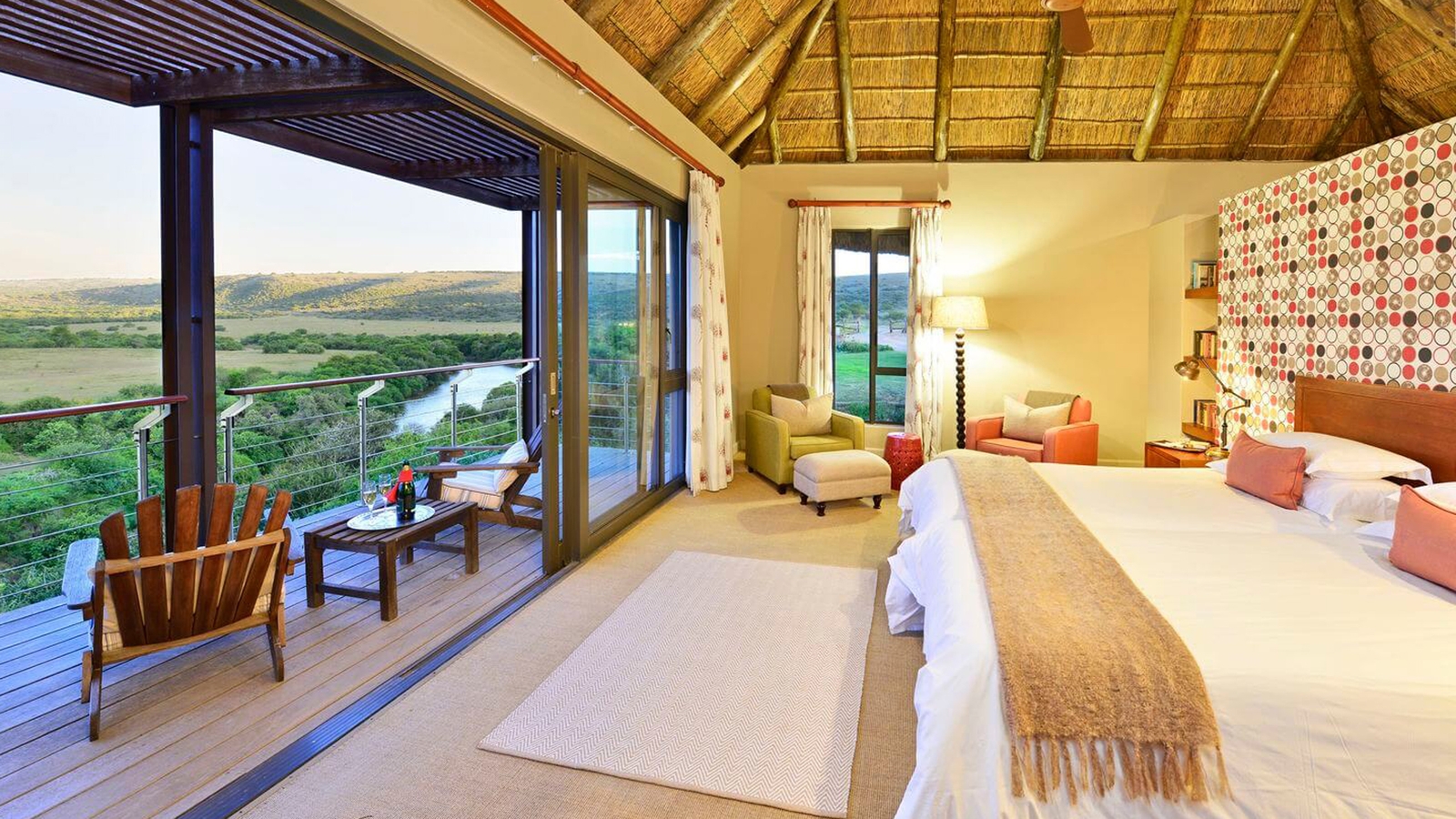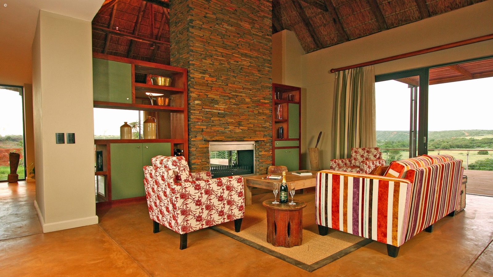 With its steep thatched roofs, indigenous timber structures, stone chimney fireplaces, wide open verandas and its perfectly poised position on the steep Great Fish River banks, this lodge successfully recreates the very homely, historical feel of an early settlers farmhouse.