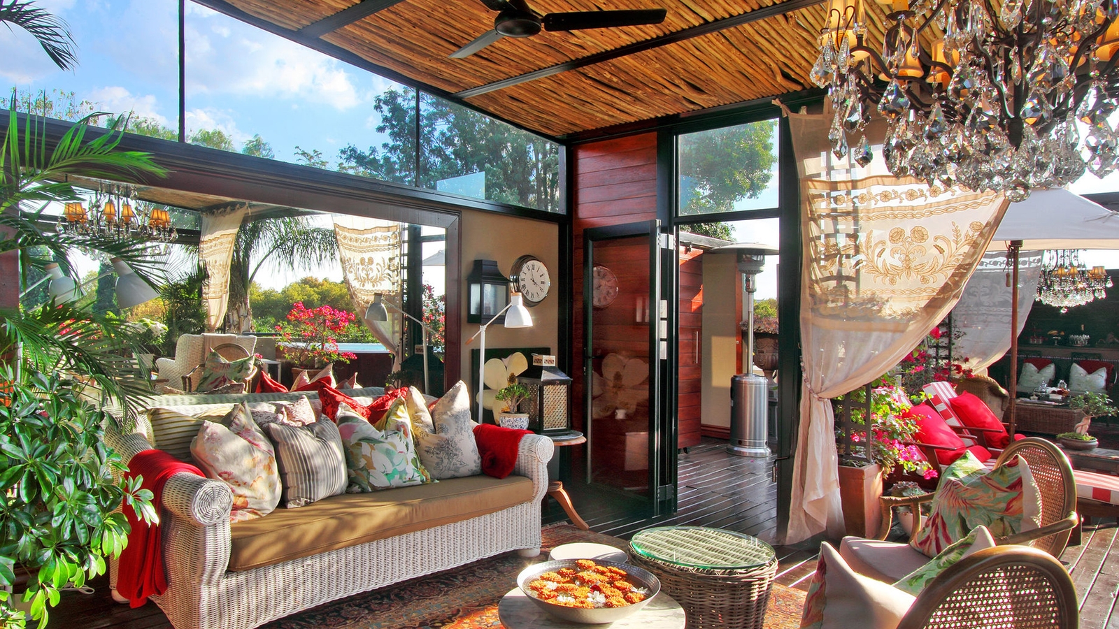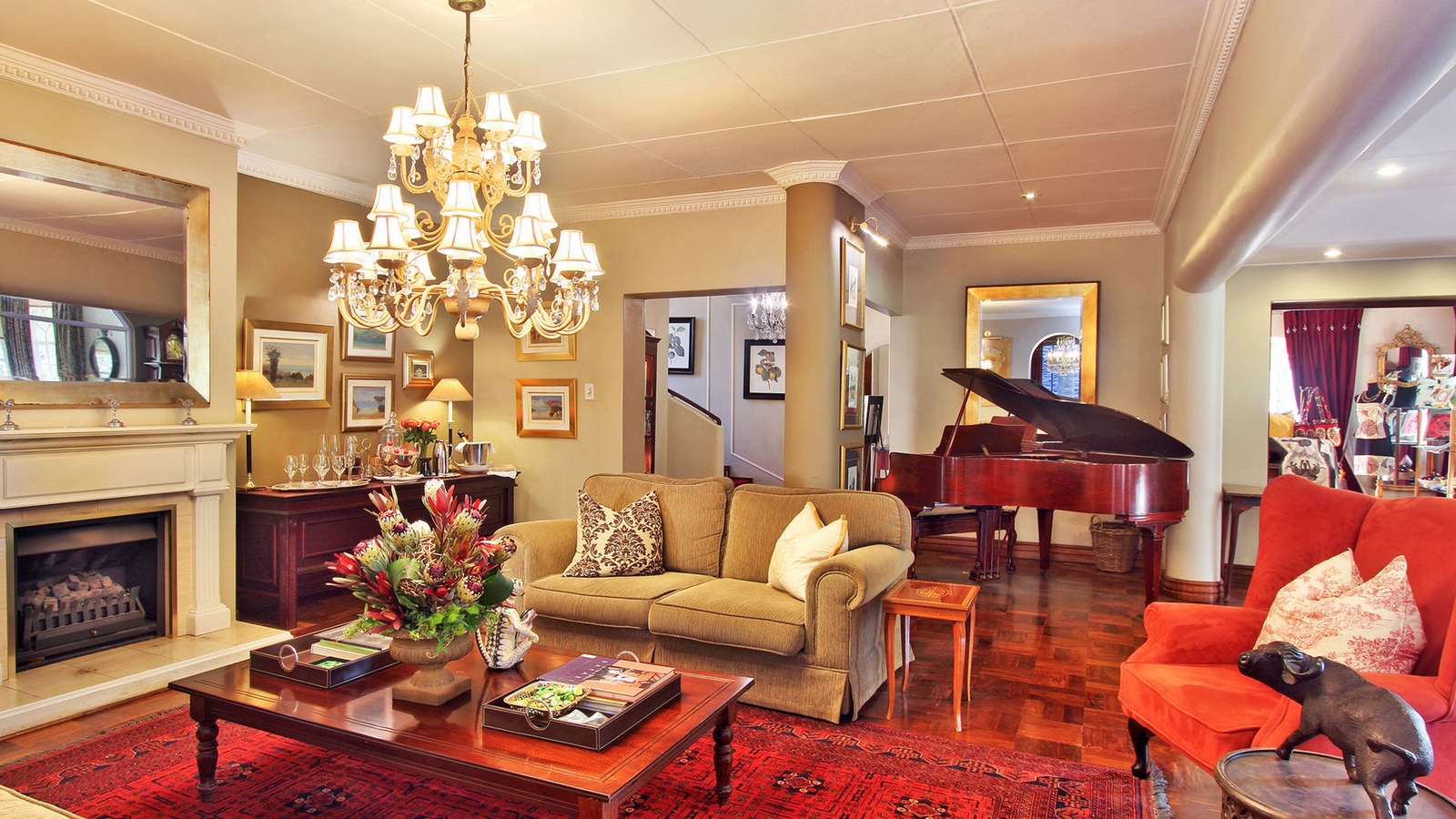 The entrance hall leads through to the sumptuous lounge and sitting room with plush furnishings inviting carefree relaxation for all seasons. A cosy log fire is lit in the fireplace on chilly days, while doors opening onto the long, spacious veranda offer a cool respite from the warm African sun.