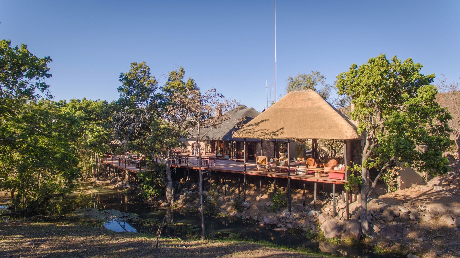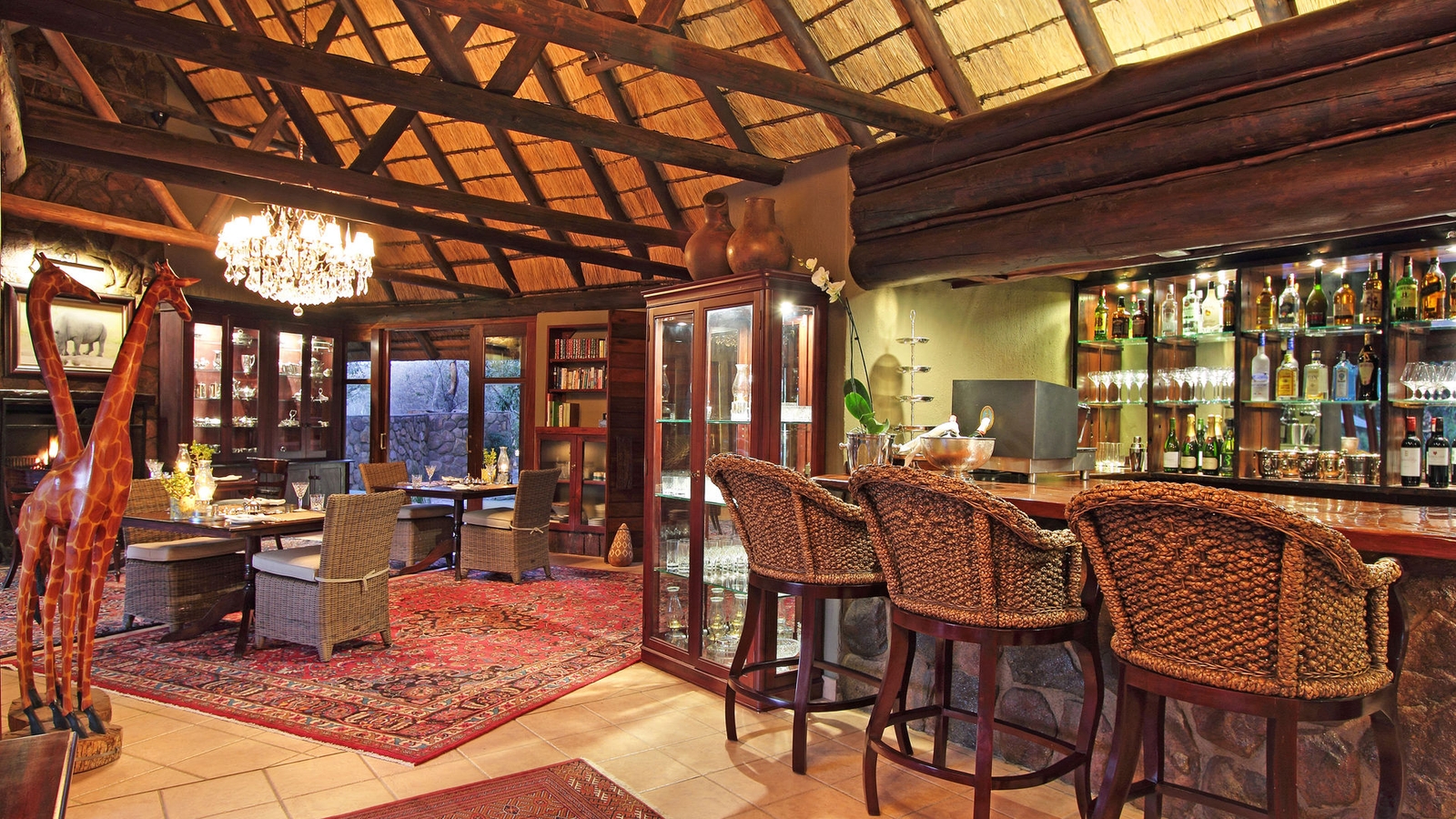Outside, you’ll find a backyard water hole which is often frequented by three hippos and the proximity of the reserve means you can easily go out on game drives to see the rhinos, elephants, and giraffes.