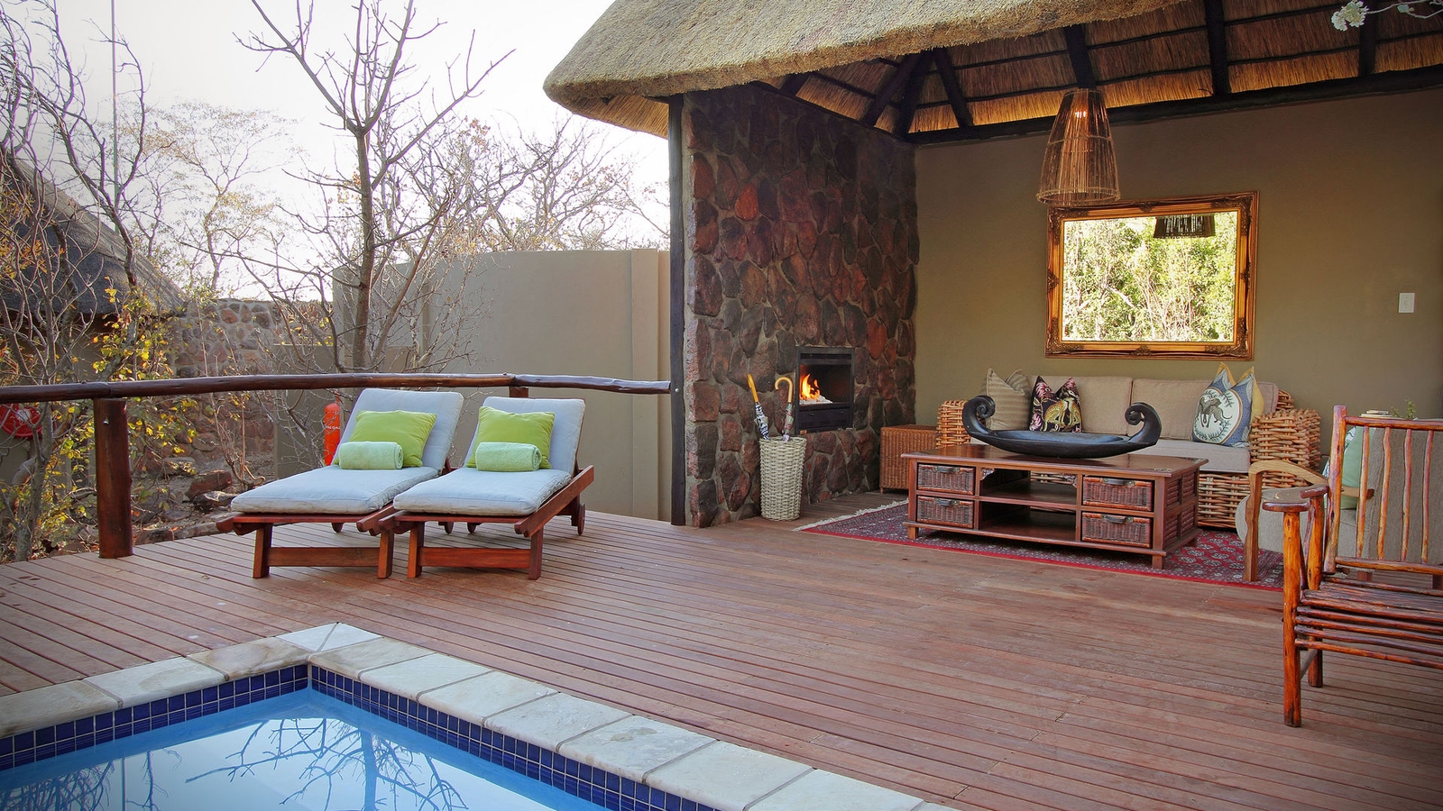 The main lodge has an expansive lounge, bar and dining spaces with its own pool and boma area. There’s also a fitness room and curio shop.