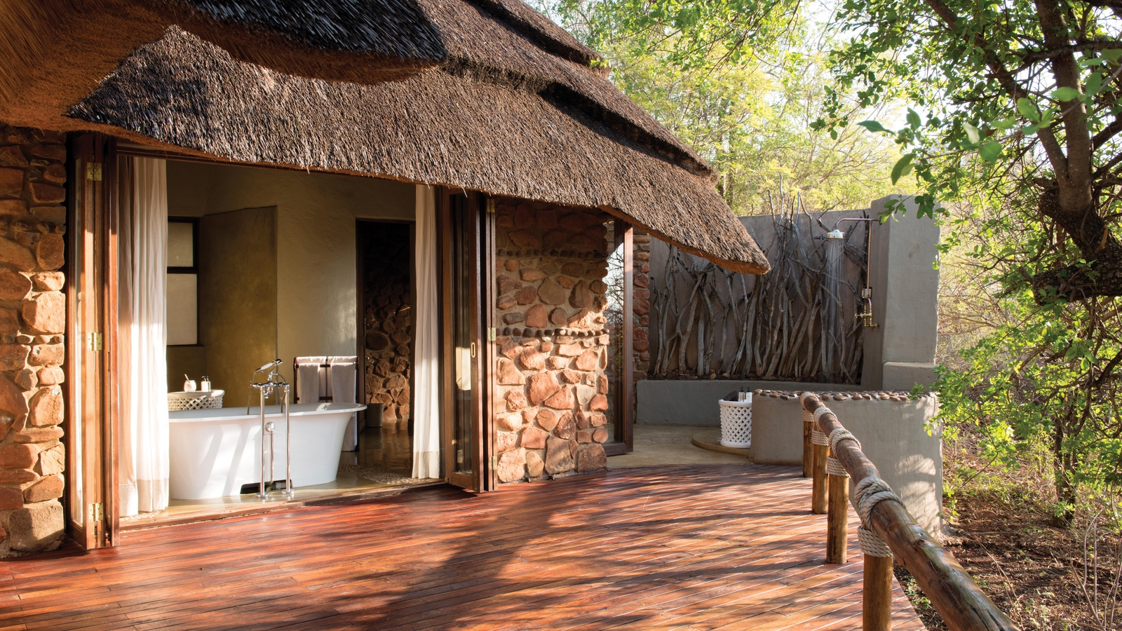 Indoor and outdoor showers and indoor Venetian bath