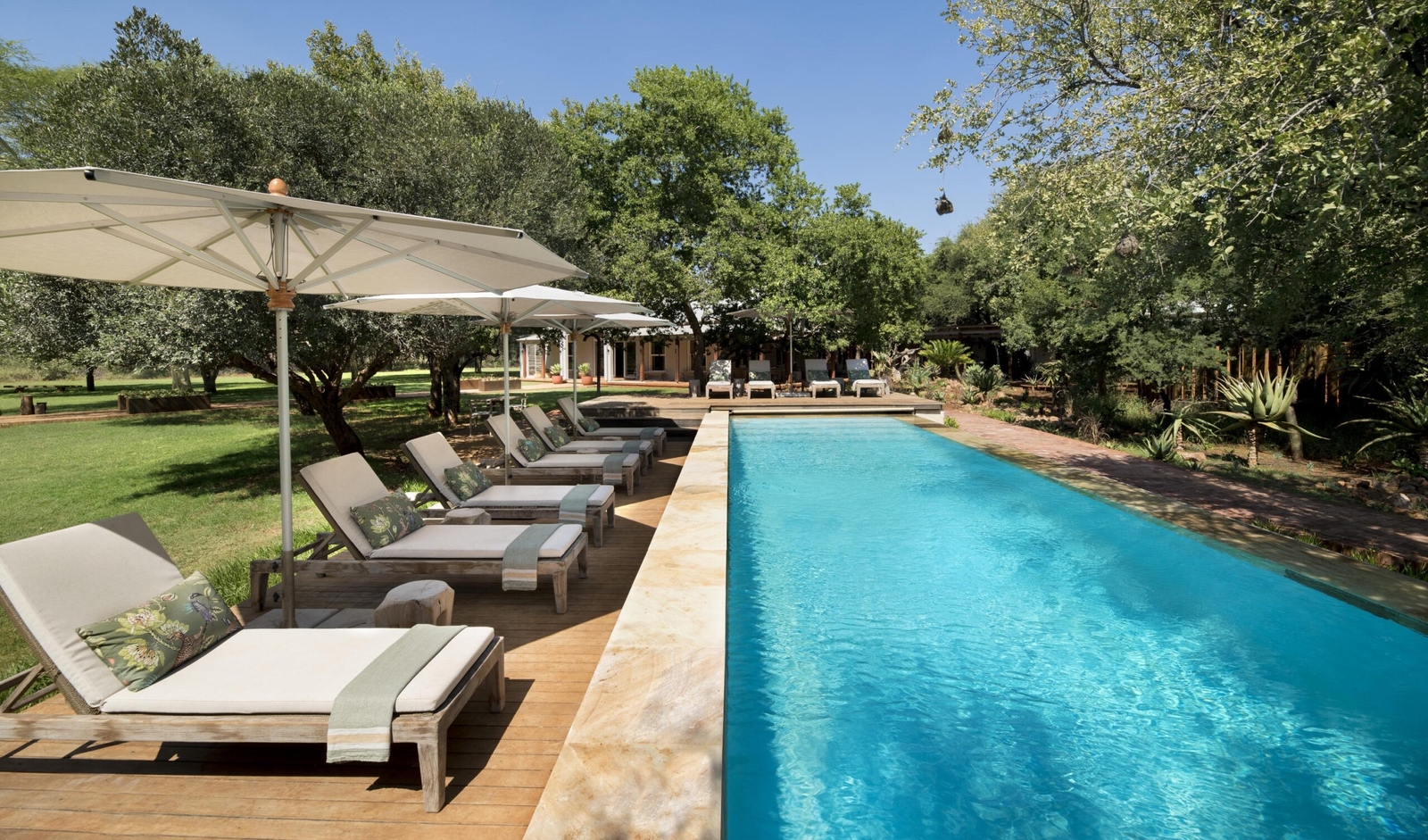 The Farmhouse, located a ten minute walk from the other two properties, accommodates groups of four to ten guests and is ideal for multi-generational travel or milestone celebrations. The Farmhouse features a warm, neutral palette and bespoke Afro-chic accents, making it a popular choice for a South African family safari. All five uniquely decorated bedrooms are connected to the main area by a covered walkway.