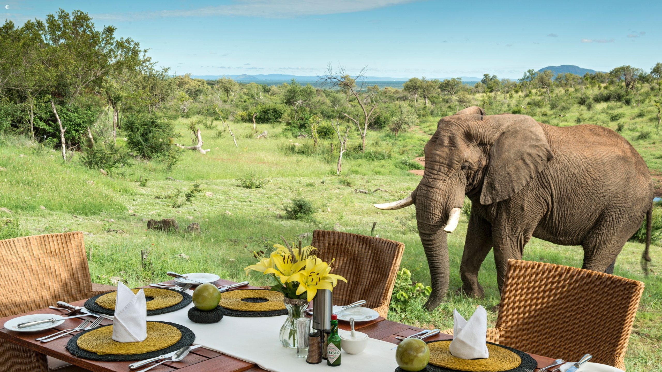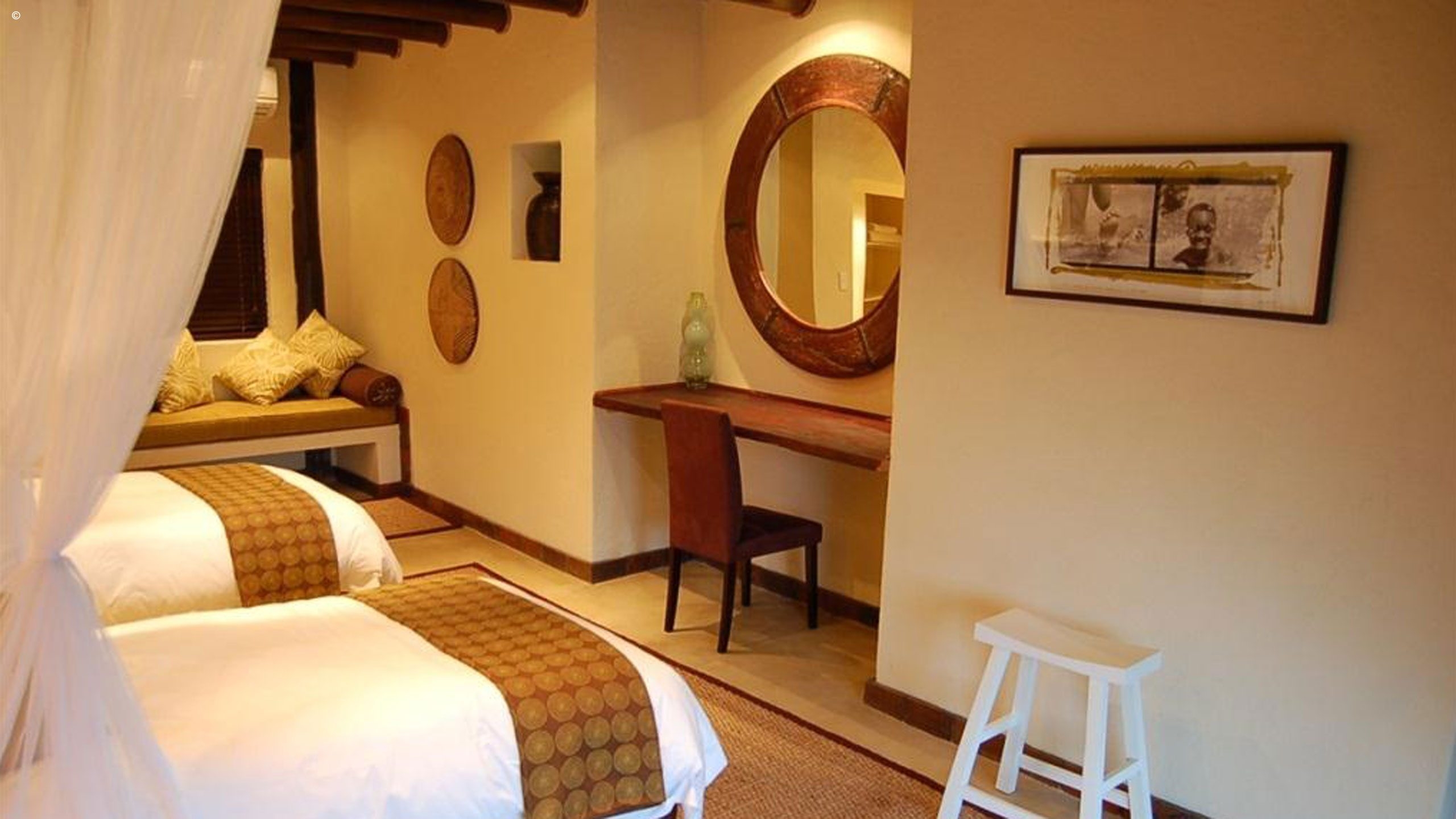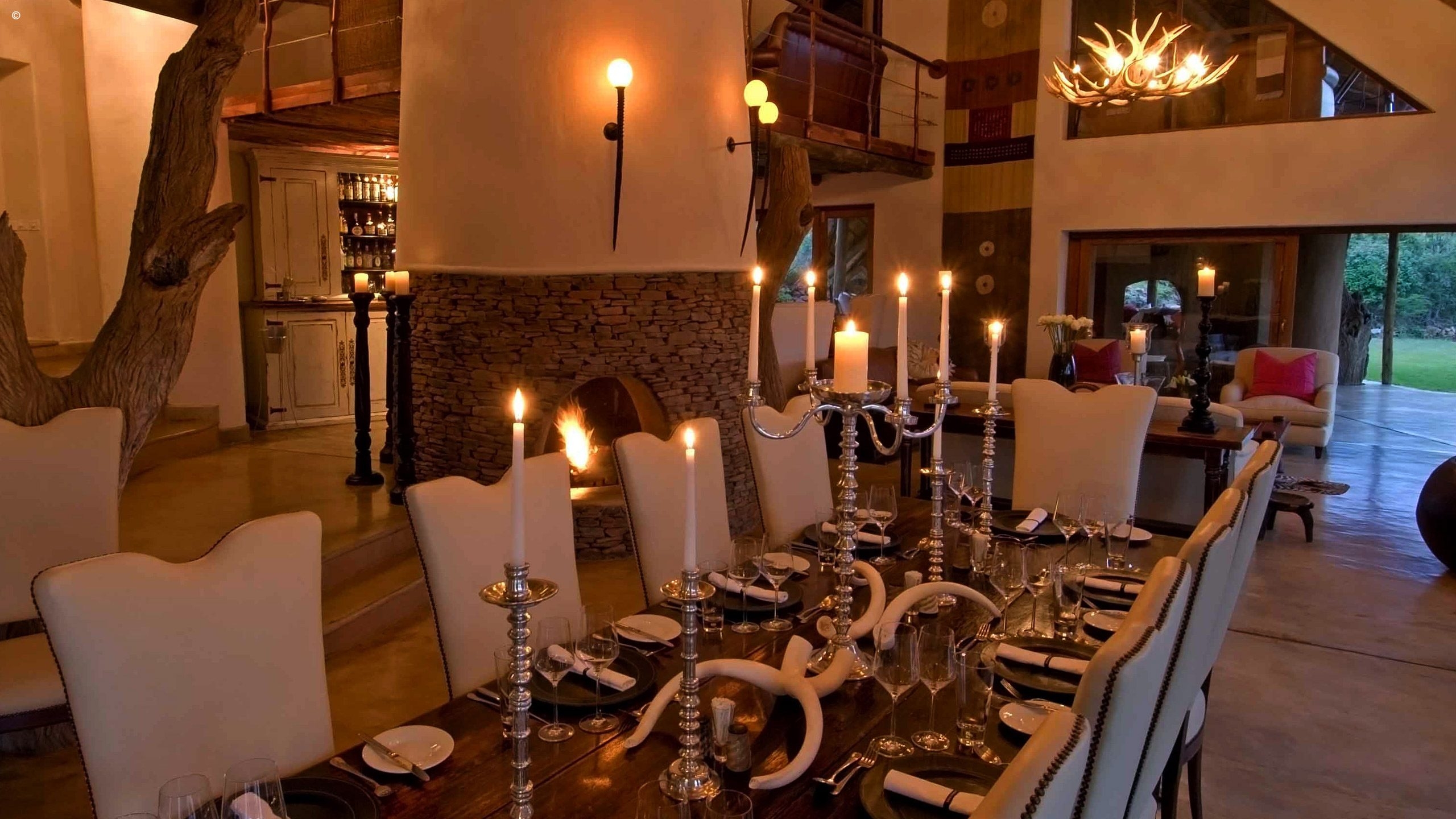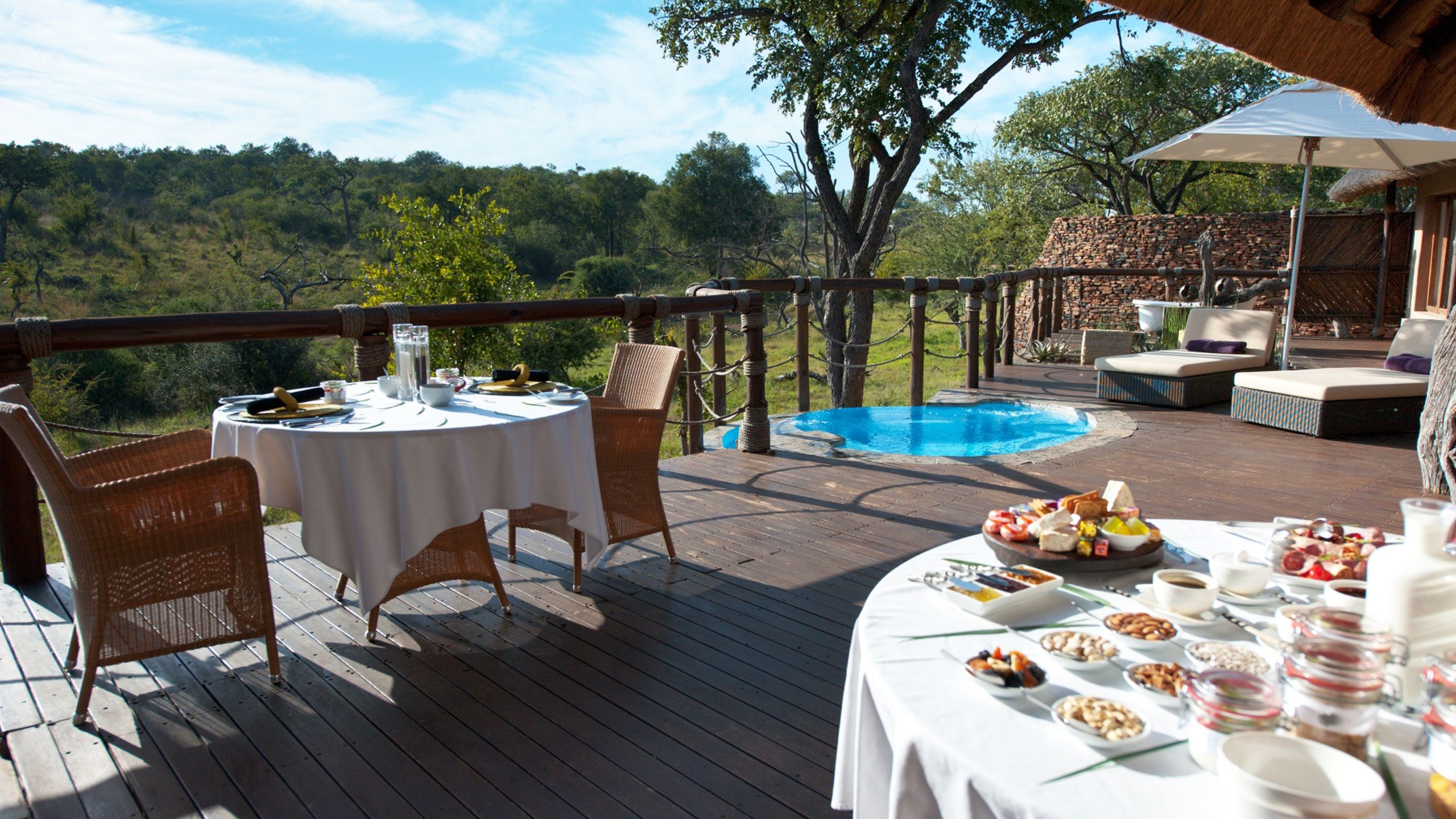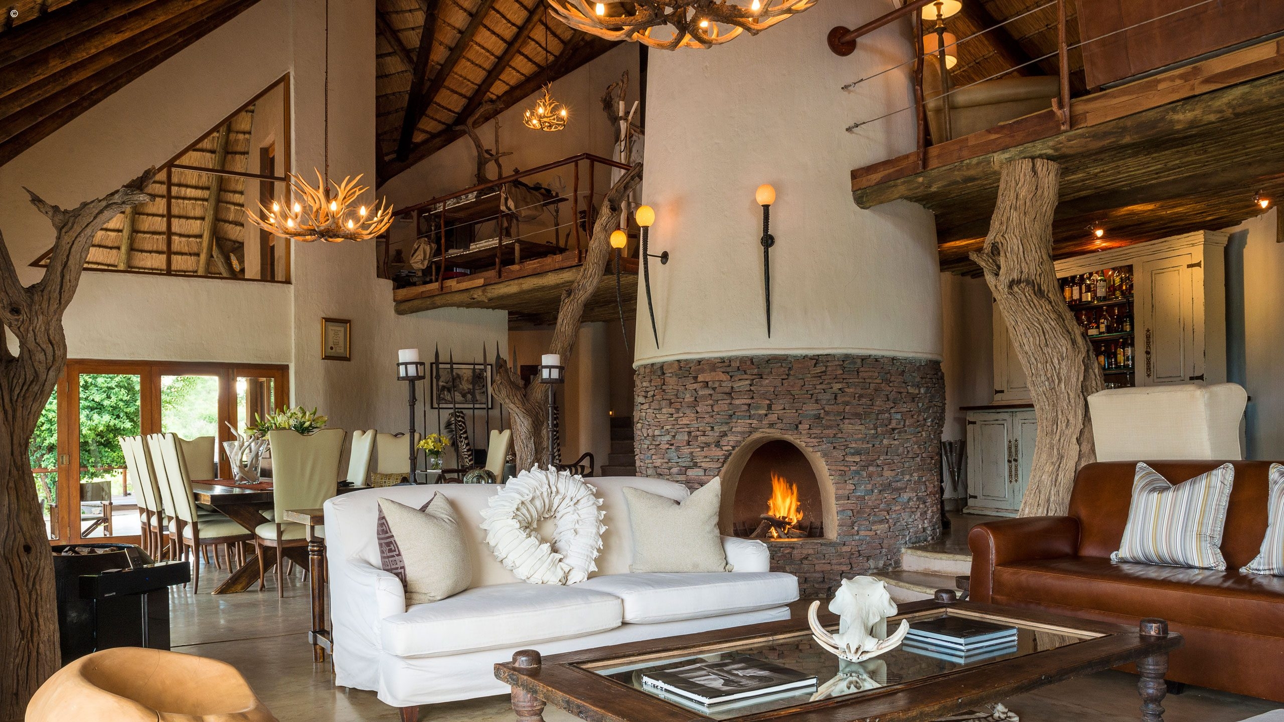 Housed within a traditional palapa-style building set into the savannah and overlooking a waterhole are five spacious suites all with en-suite bathrooms: two in the main Royal Clubhouse, and the rest are freestanding next to this. The theme is kept contemporary, luxurious yet African throughout with the usual earthy palette interrupted in places by flashes of colour.