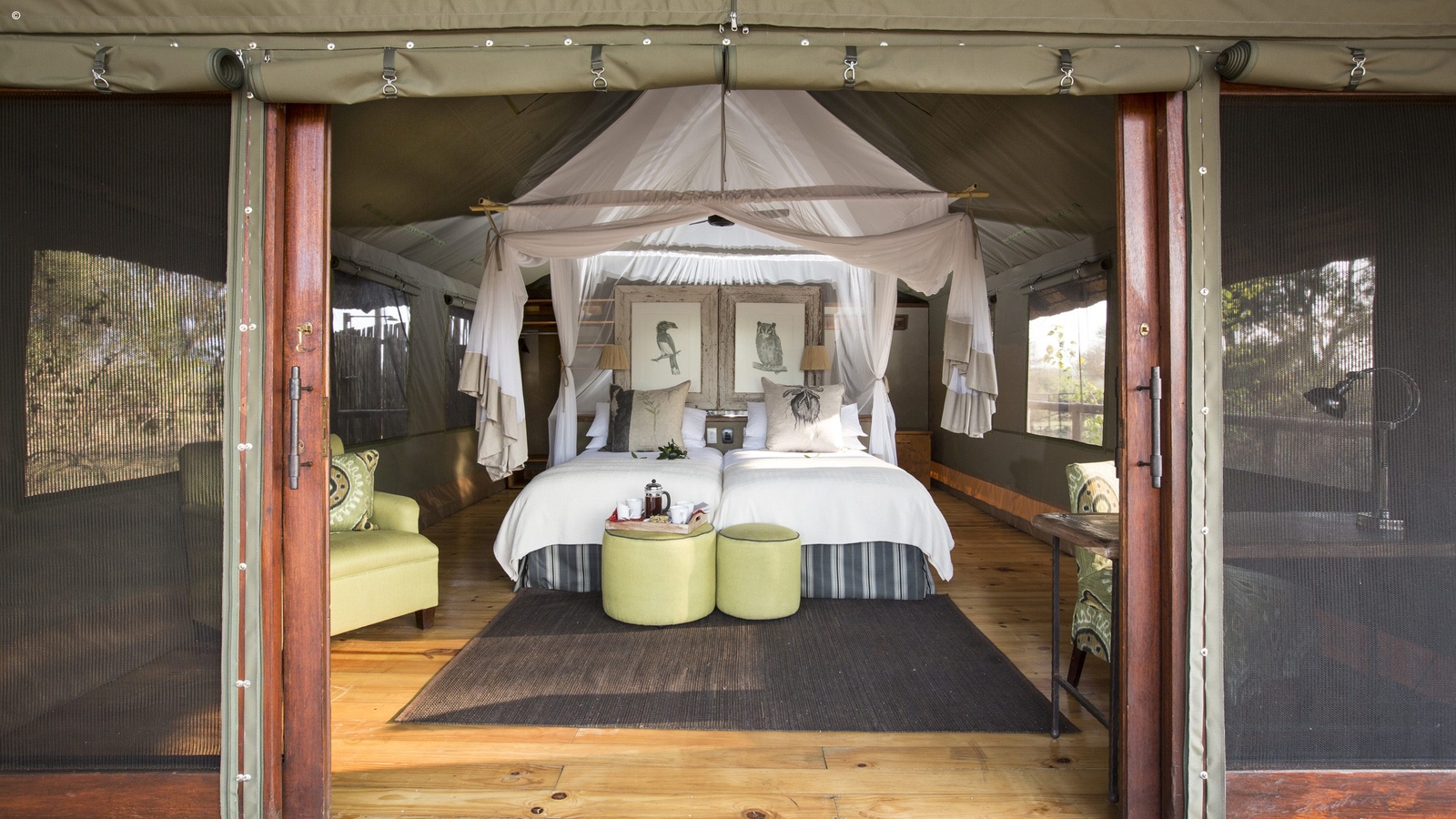 This stylish camp has 19 luxury tents with en-suite bathrooms, expansive viewing decks, vast beds and outdoor showers. Seven are family tents with two additional single beds to the back of the tent.