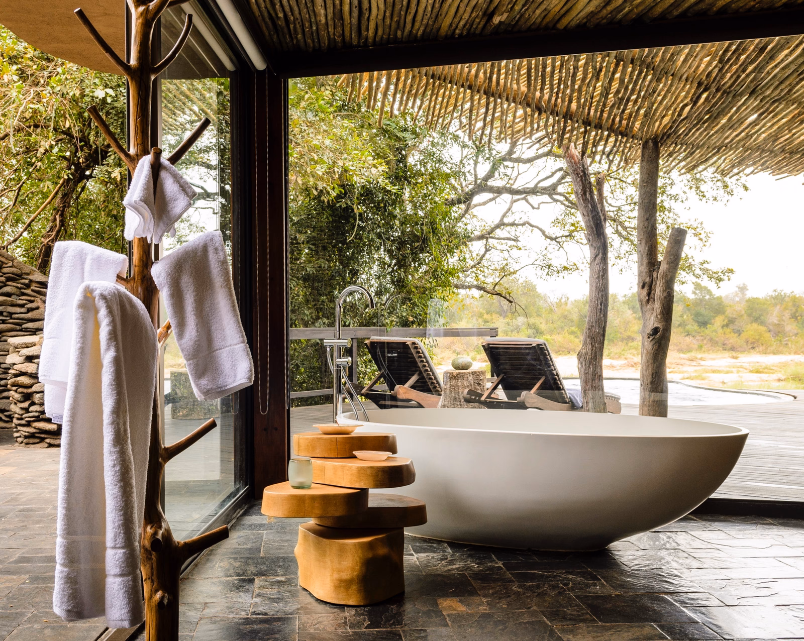 Set along the boulder-strewn banks of the Sand River, Boulders Lodge harmonises effortlessly with its surroundings, designed to reflect the light, colours and textures of the African wilderness. Each of the twelve suites features interiors that open onto expansive wooden decks, offering uninterrupted views of the Sand River or the bush. The expansive glass-fronted suites create a seamless transition between the indoors and the wilderness outside. Inside, handcrafted furnishings made from fossilised tree stumps, solid stone and wrought iron are softened by luxurious details such as natural flax linens and cloud-like cotton towels.