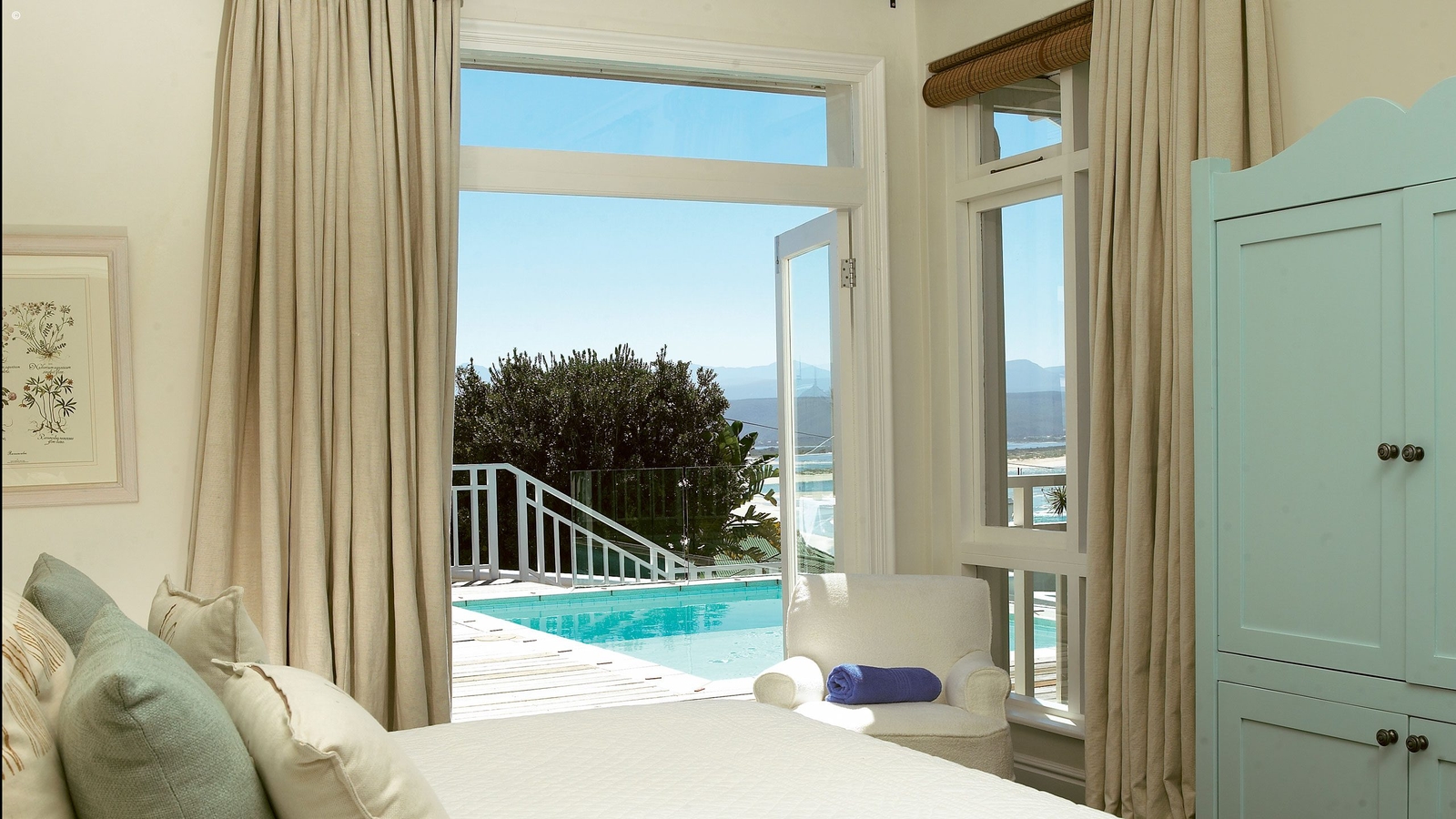 Two bedrooms with en-suite bathrooms, a large sitting room with a fireplace, a dining room and a small service kitchen are all yours to singularly enjoy. You’ll also have the use of your own private swimming pool and a spacious deck overlooking both the beach and surrounding mountains of Plettenberg Bay. The villa boasts a stylish yet warm decor throughout, decorated in soft creams and blues with bleached wooden floors. Modern conveniences such as full air-conditioning, flat-screen televisions with DVD players and satellite TV channels, and WiFi make it ideal as a family base.