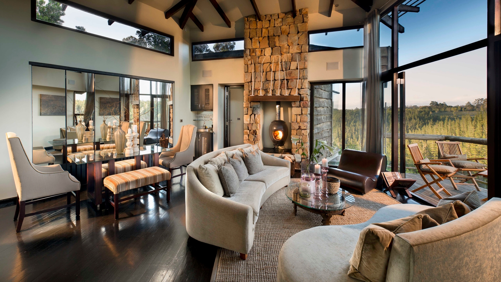 A stylish treetop lodge hotel sits aloft a tall coastal forest, blending Afro-Baroque décor’s earthy colours, rich textures and handcrafted fittings with opulent luxuries and the fabulous setting. 10 private suites are tucked into the canopy, extending into the forest with private decks and infinity pools. There are also six lavish two-bedroom villas which also gain large lounges with a fireplace and dining area.