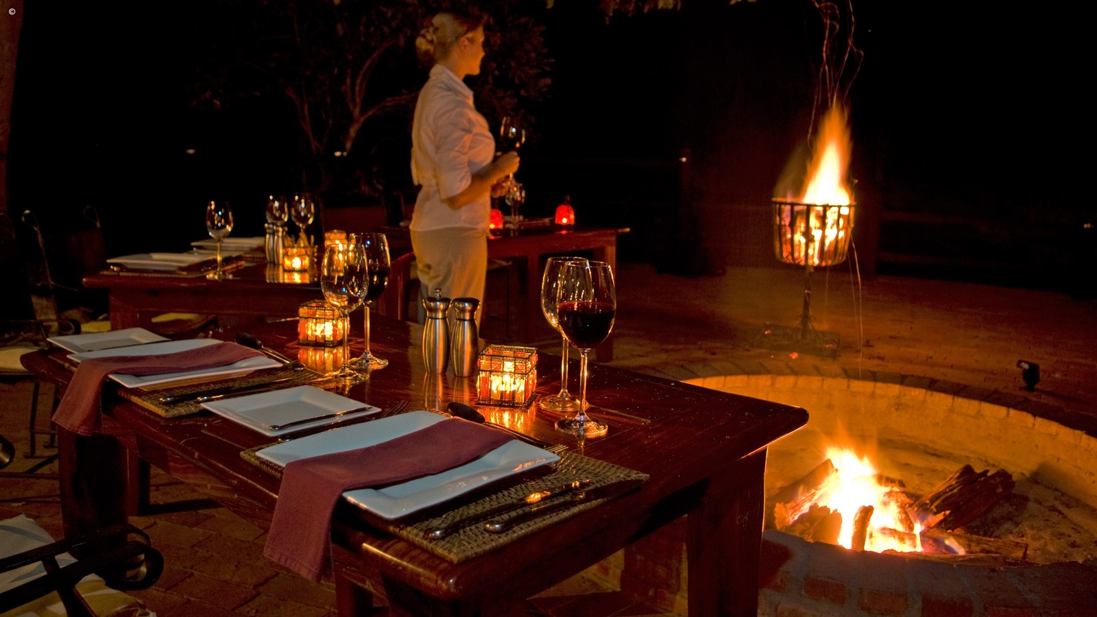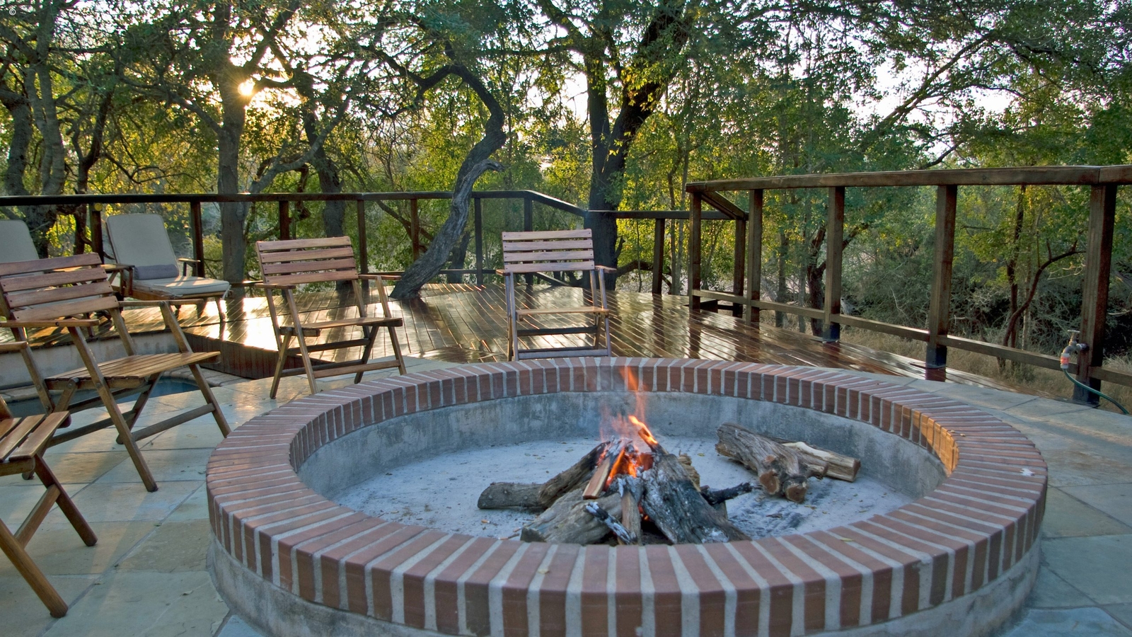 Lodging consists of five luxury suites, all of which have overhead fans, air conditioning, open fireplaces and glass fronts with private viewing decks into the magical African bush. Bathrooms (all with in- and outside showers) have their own glass picture windows to watch the wild world go by as you wash off the heat of the day. The double suite Presidential unit includes a private dining room, lounge, plunge pool and fireside facilities.