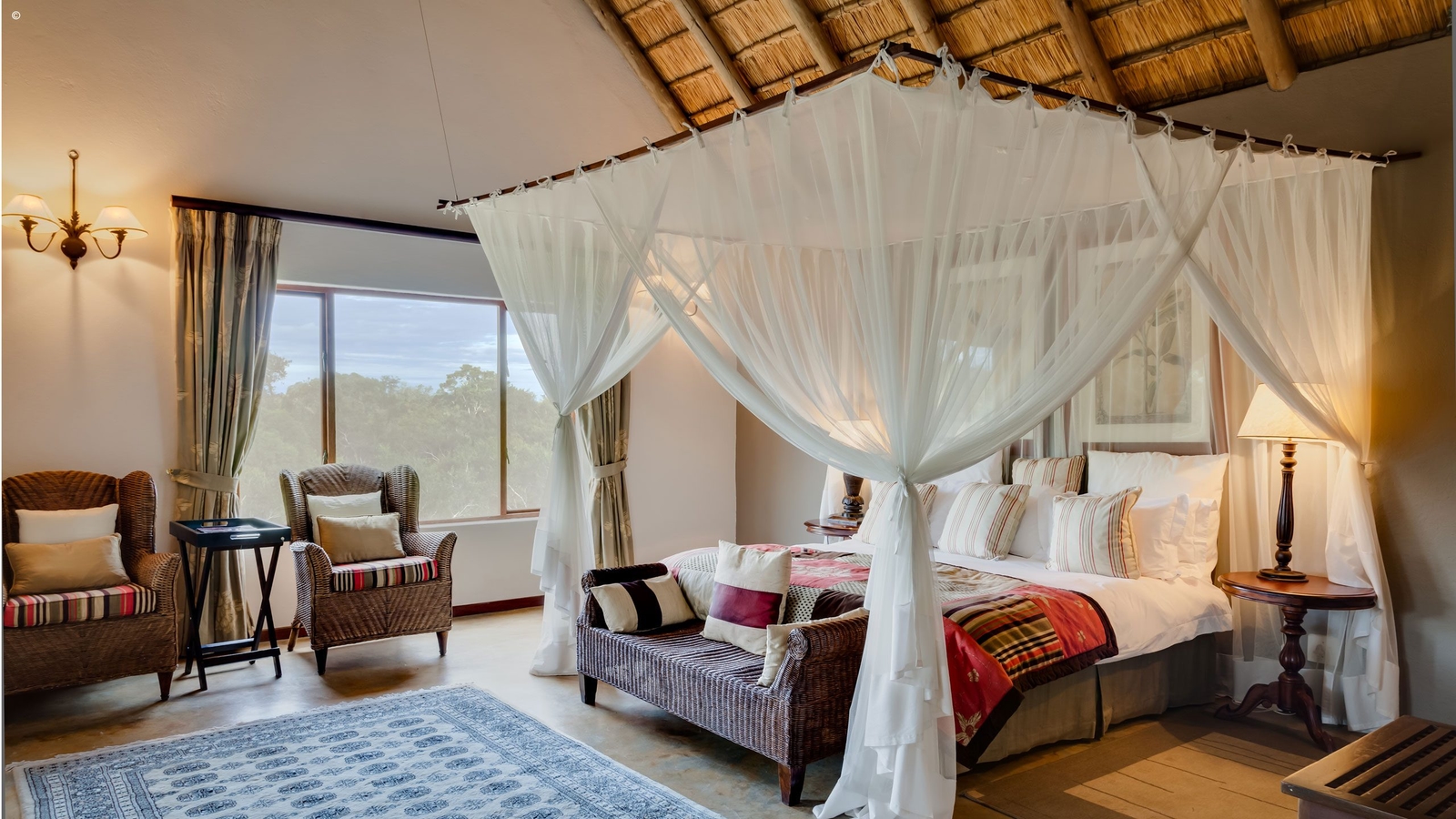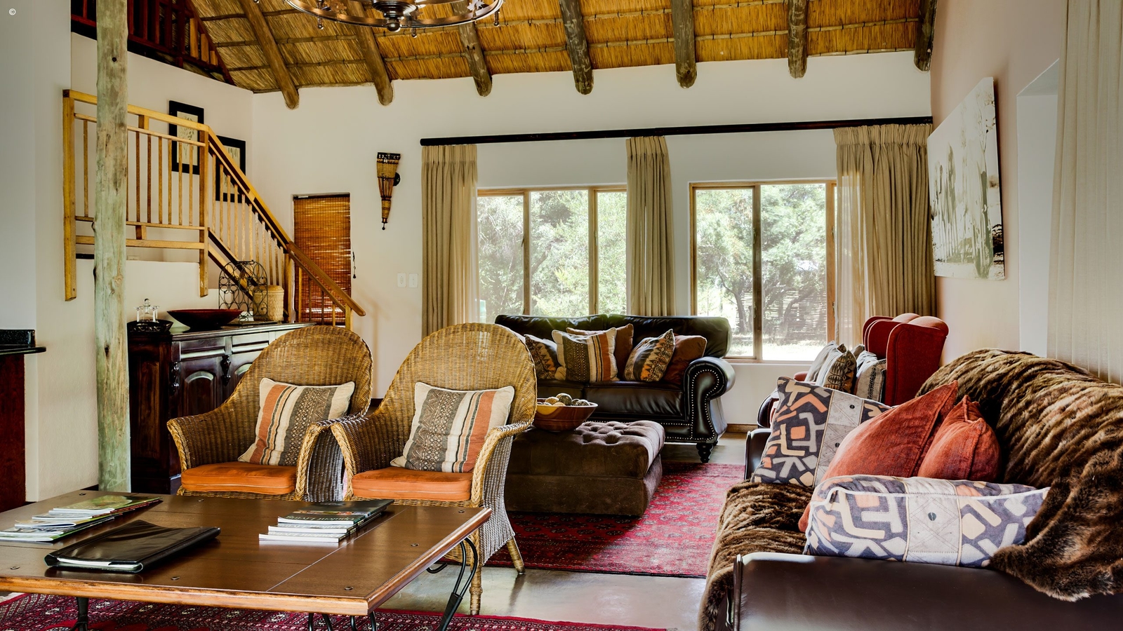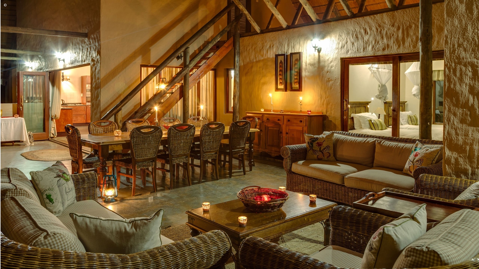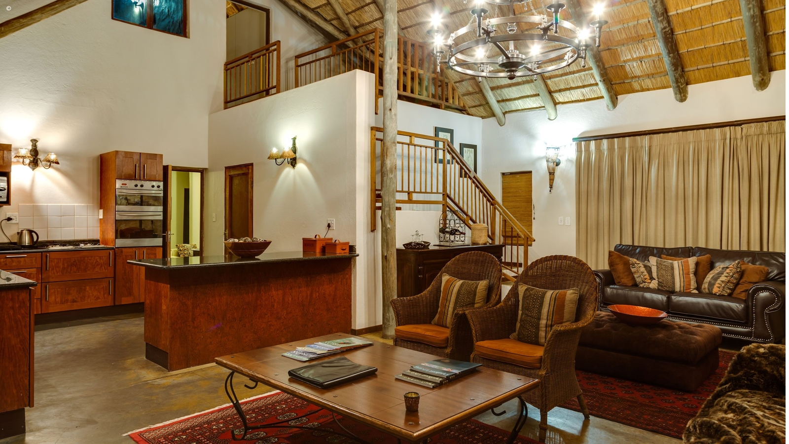 Inside the large thatched villa modern comforts are blended with African influences. The six elegant en-suite bedrooms are air-conditioned, with the upstairs main room boasting beautiful views over the bush. Guests can explore this amazing environment with the safari vehicle, experienced guide and tracker which are all included during the stay.
