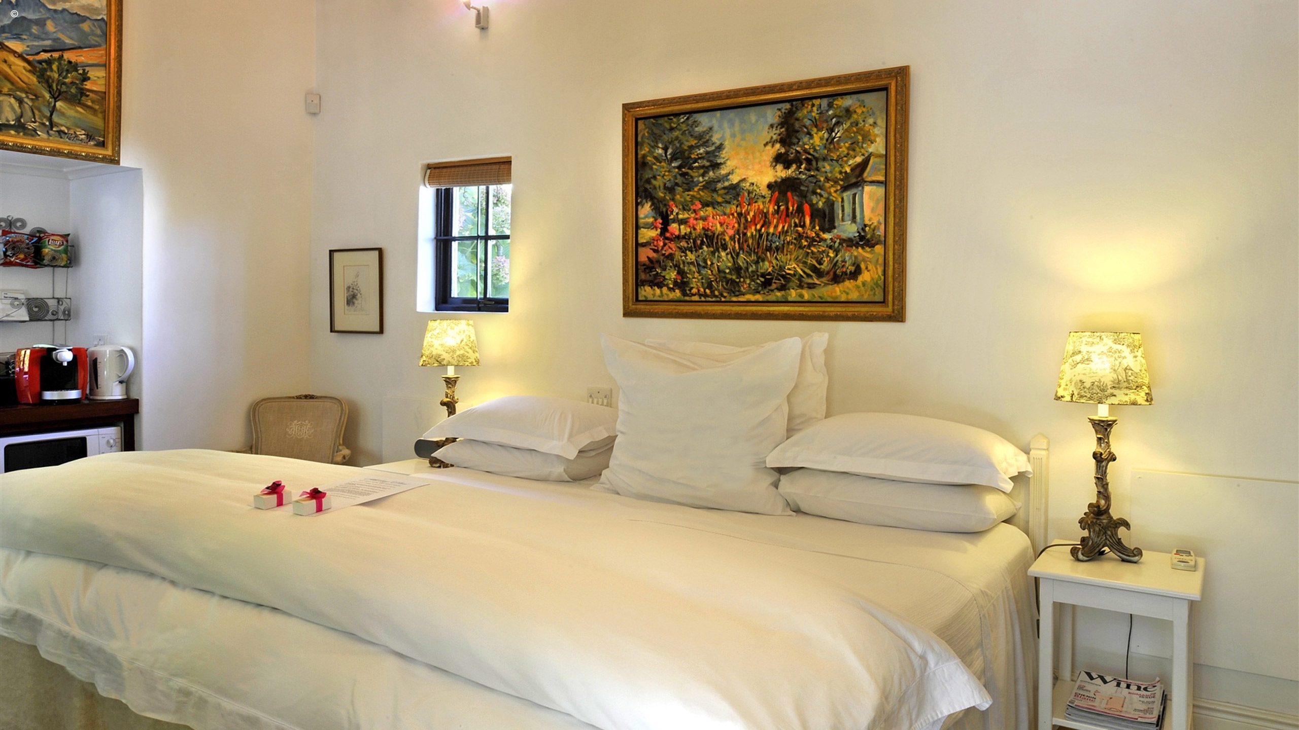 There are three guest cottages, each with its own private pool surrounded by the garden’s rambling hedges and trees; the feel is as intimate outside as it is within the houses themselves. There are also three suites: two in the Cape-Dutch style main house and one in a free-standing building adjacent to this. These suites share a large solar-heated pool. All have been decorated with an appealing mix of antique and contemporary furnishings.