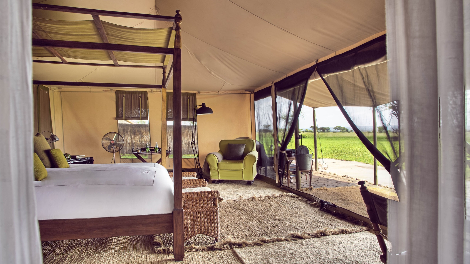 Eight luxury tented suites are widely spaced to ensure absolute privacy, sat on the edge of a palm island overlooking Lake Manyara waters. One is a family suite with two bedrooms.