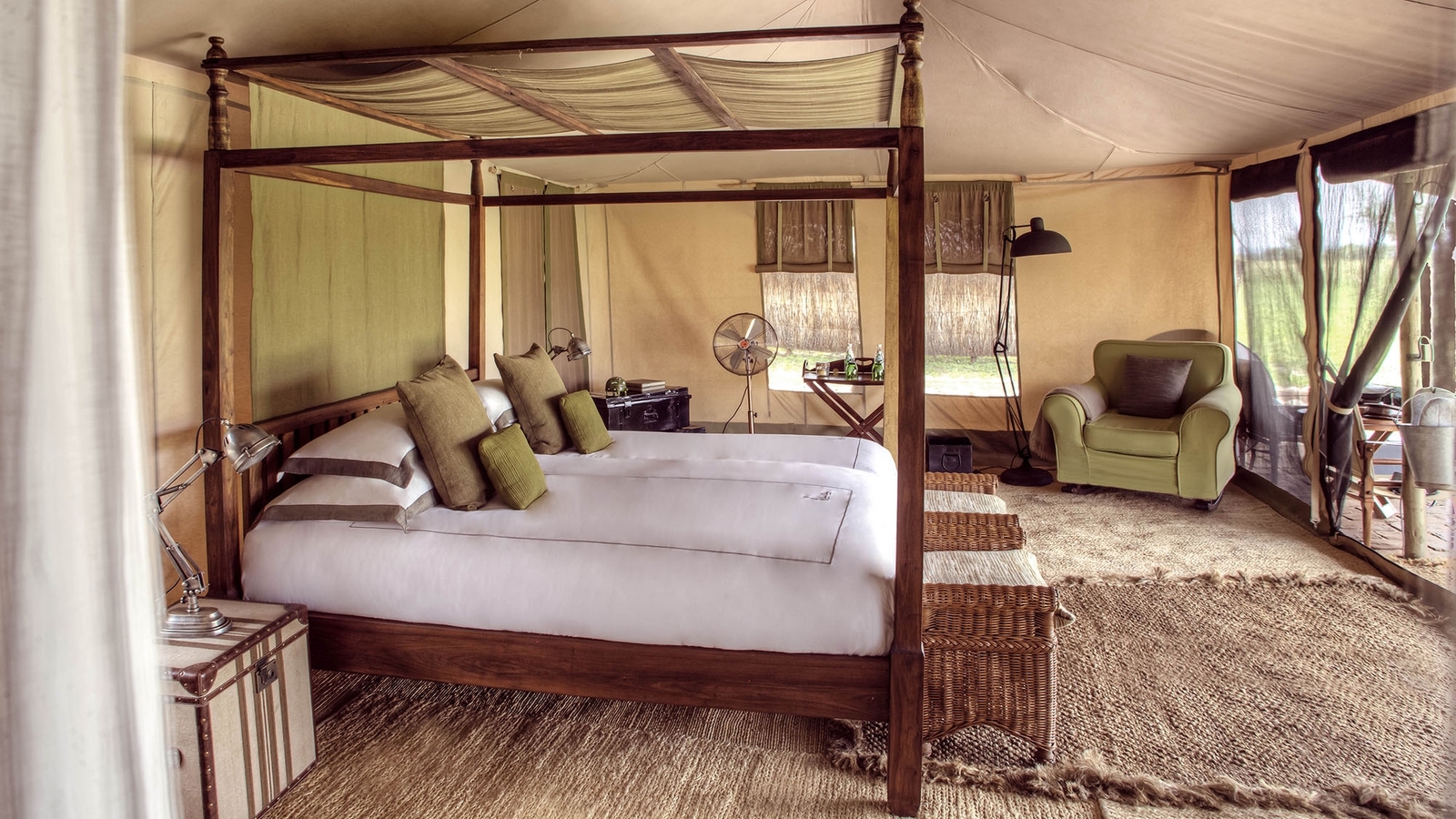 Six tents are far from basic, with en-suite shower rooms housing hot-water bucket showers and flushing toilets, a study desk, rocking chair and a dressing room. Outside, find a private fire pit whose crackles twinned with the sound of the African wilderness at night evoke a prehistoric notion of place.
