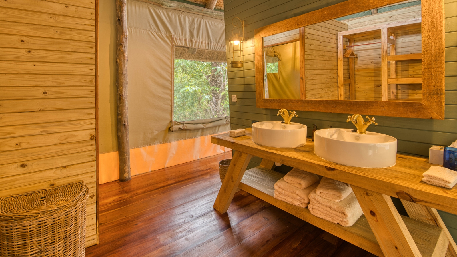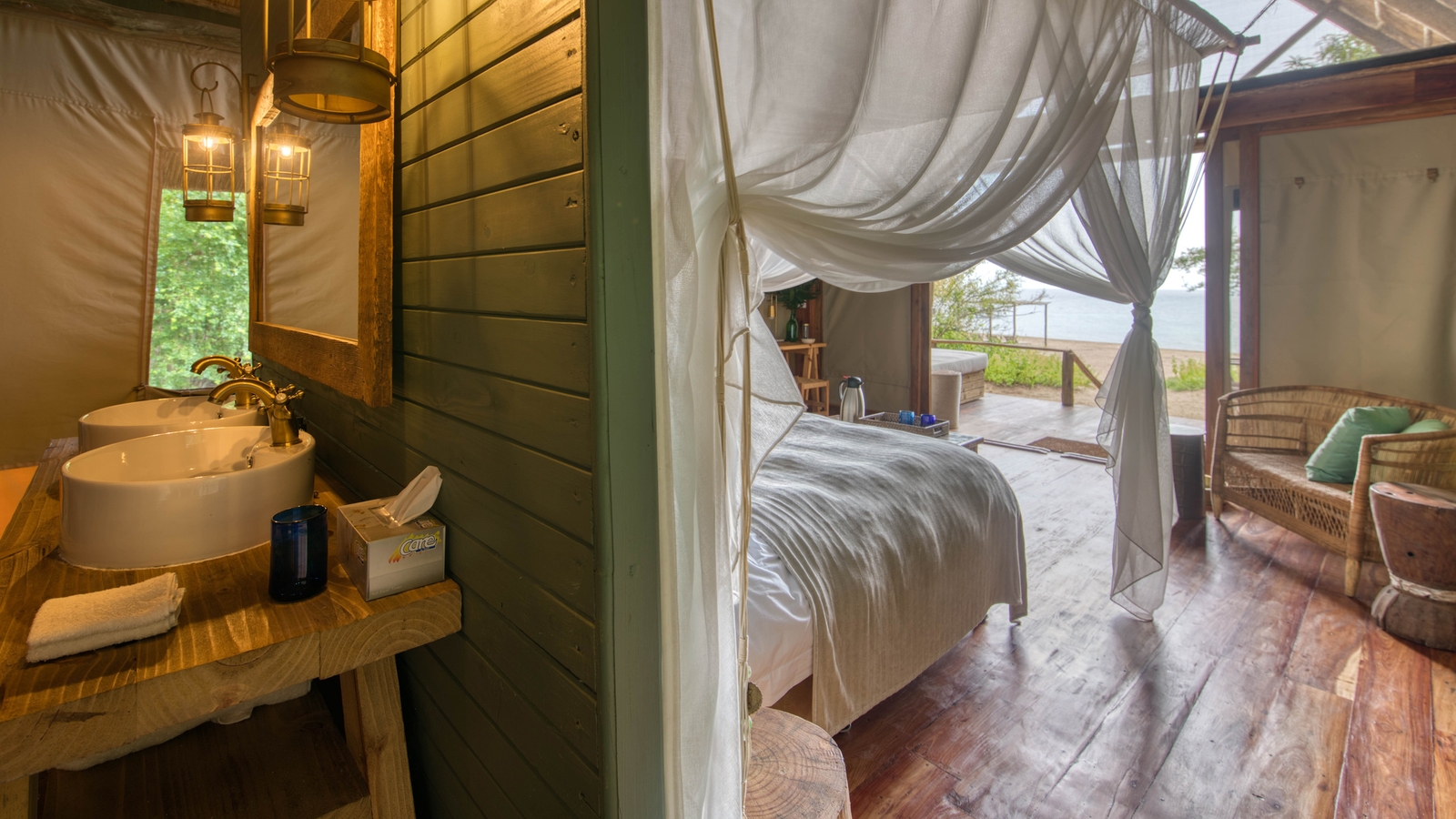 Quite romantically located on sandy white beaches of Lake Tanganyika with the Mahale Mountains as a backdrop, this lodge is an activity rich retreat with a bit of luxury thrown in. Each of the nine tents have four poster beds and are raised up on hardwood floors with the forest subtly creeping up behind them. The private patio areas are perfect for a morning coffee while enjoying views over the clear waters of the lake and the odd splash as fish chase their breakfast in the calm waters.