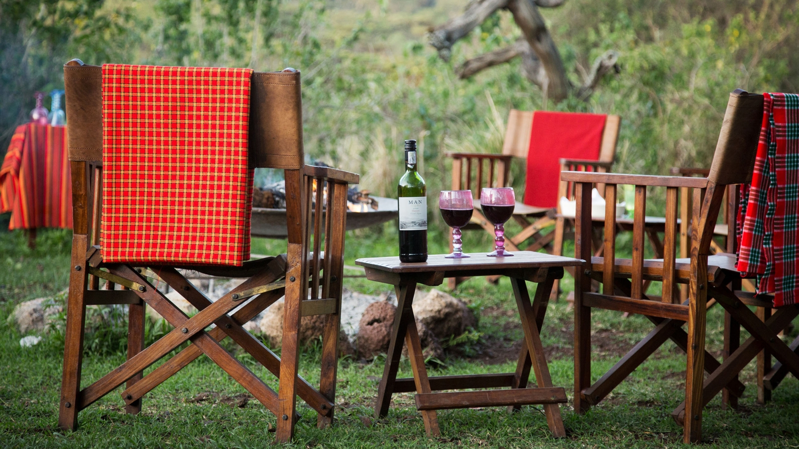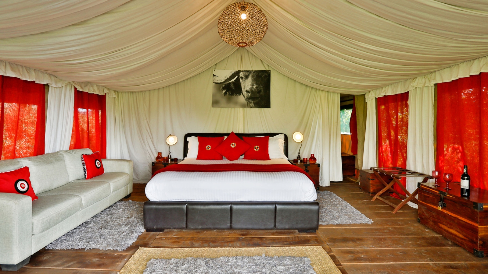The mess tent is beautifully furnished with grand sofas, lamps, book shelves and corner cabinets in old wood, chests and rugs. In the evening, you all gather around the campfire for sundowners before dining under chandeliers,