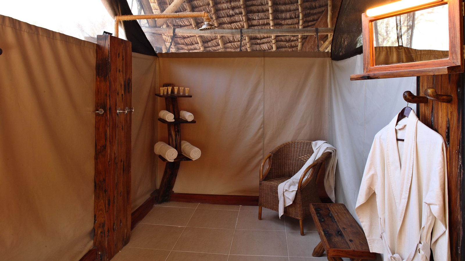 The camp features a bar, lounge, restaurant, pool and an open wooden terrace shaded by a high thatched roof and filled with comfortable sofas and striking furniture made of reclaimed dhow wood. The camp’s eight tented-rooms are built on raised wooden platforms and housed under thatched roofs. Each has it’s own bathroom and a spacious private veranda overlooking the riverbed.