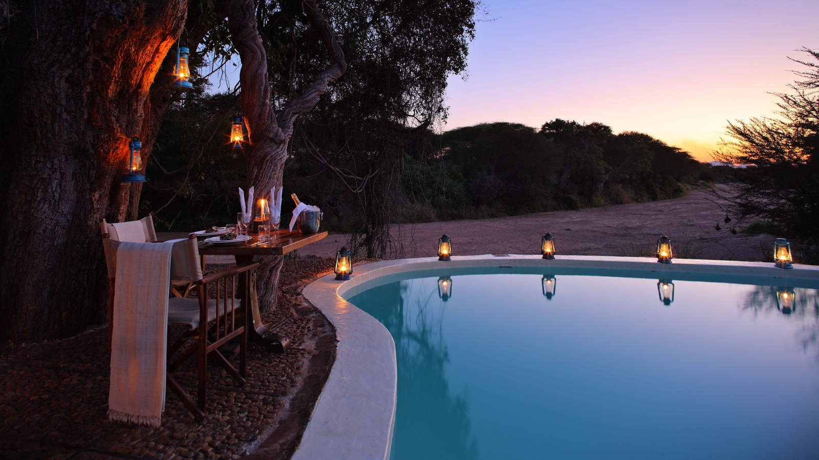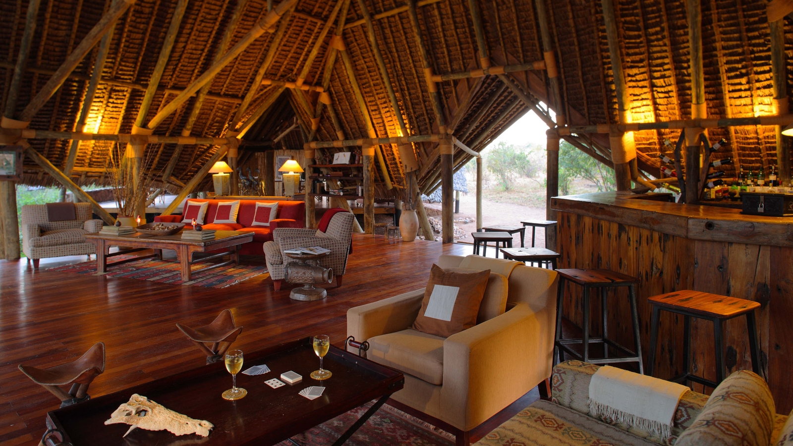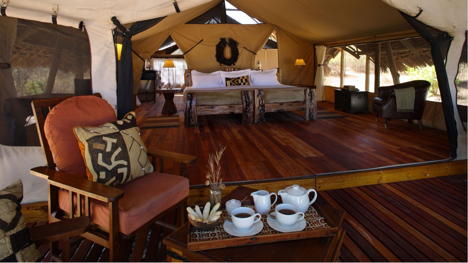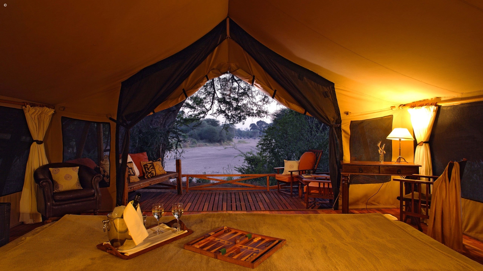 The camp features a bar, lounge, restaurant, pool and an open wooden terrace shaded by a high thatched roof and filled with comfortable sofas and striking furniture made of reclaimed dhow wood. The camp’s eight tented-rooms are built on raised wooden platforms and housed under thatched roofs. Each has it’s own bathroom and a spacious private veranda overlooking the riverbed.