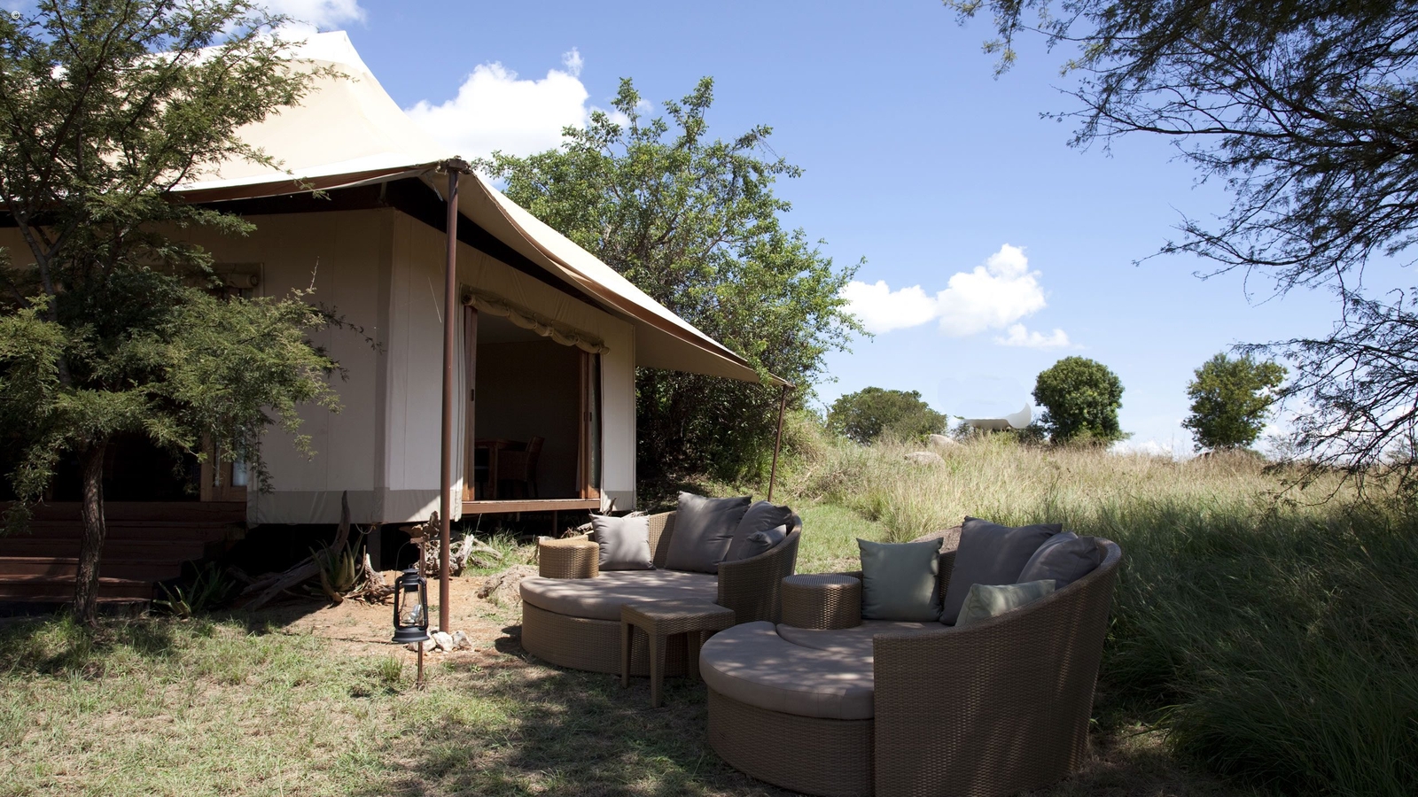 A larger scale of luxury based in the northern part of the Serengeti, Sayari has 15 permanent raised-deck tents with wide deck verandas that overlook the bushy scrubland around the camp.